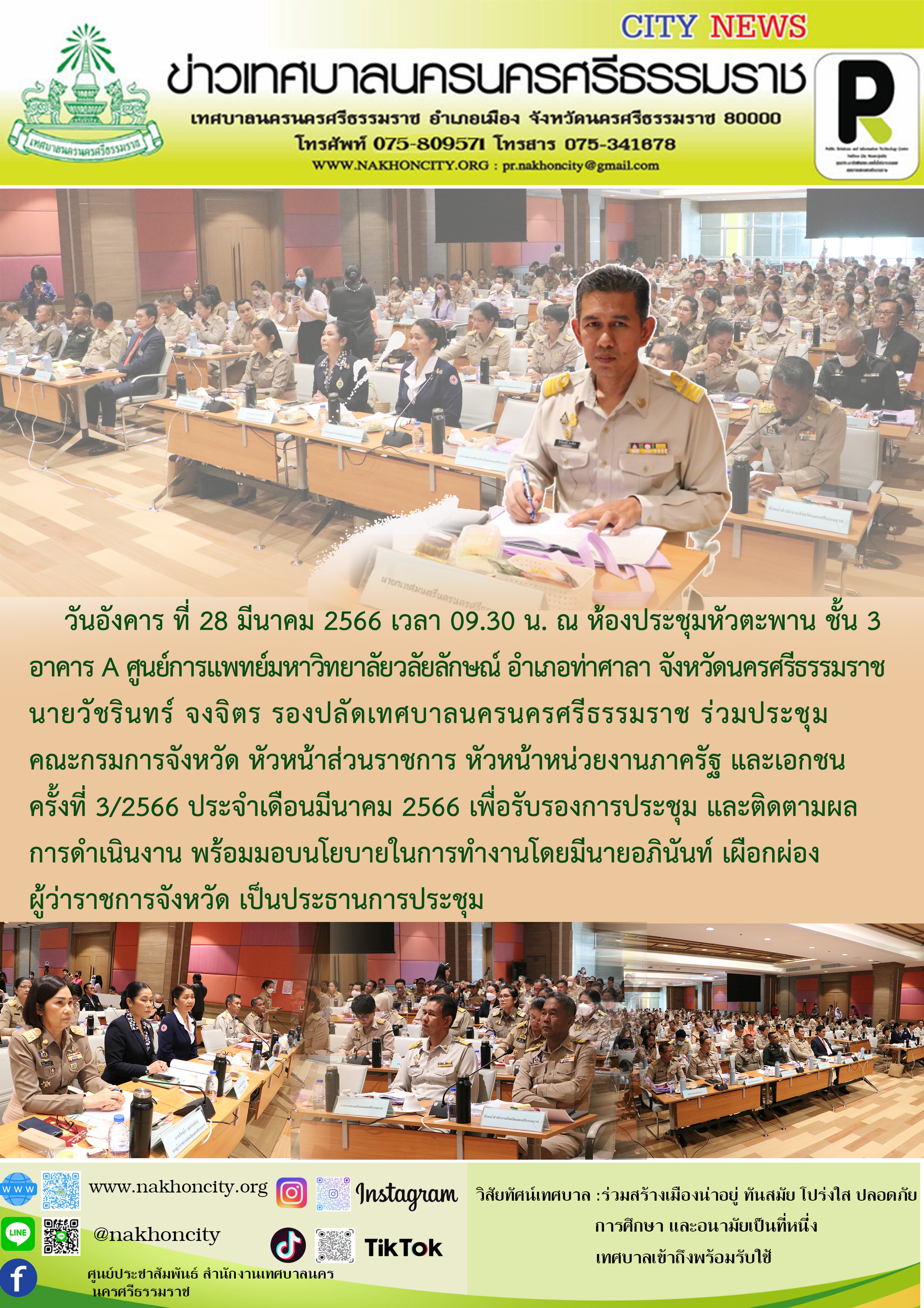 | นายวัชรินทร์ จงจิตร รองปลัดเทศบาลนครนครศรีธรรมราช ร่วมประชุมคณะกรมการจังหวัด หัวหน้าส่วนราชการ หัวหน้าหน่วยงานภาครัฐ และเอกชน ครั้งที่ 3/2566 ประจำเดือนมีนาคม 2566 |