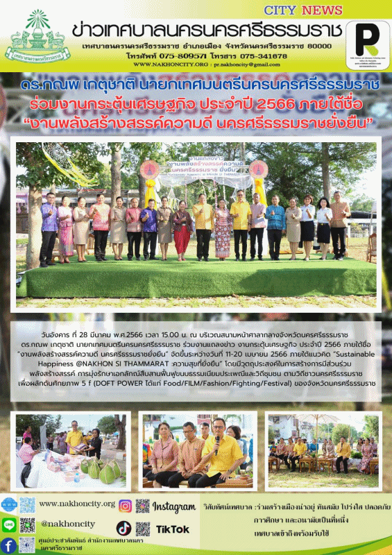 | วันอังคาร ที่ 28 มีนาคม พ.ศ.2566 เวลา 15.00 น. ณ บริเวณสนามหน้าศาลากลางจังหวัดนครศรีธรรมราช ดร.กณพ เกตุชาติ นายกเทศมนตรีนครนครศรีธรรมราช ร่วมงานแถลงข่าว งานกระตุ้นเศรษฐกิจ ประจำปี 2566 ภายใต้ชื่อ “งานพลังสร้างสรรค์ความดี นครศรีธรรมราชยั่งยืน” จัดขึ้นระหว่างวันที่ 11-20 เมษายน 2566 ภายใต้แนวคิด “Sustainable Happiness @NAKHON SI THAMMARAT :ความสุขที่ยั่งยืน” โดยมีวุตถุประสงค์ในการสร้างการมีส่วนร่วม พลังสร้างสรรค์ การมุ่งรักษาเอกลักณ์สืบสานฟื้นฟูขนบธรรมเนียมประเพณีและวิถีชุมชน ตามวิถีชาวนครศรีธรรมราช เพื่อผลักดันศักยภาพ 5 f (DOFT POWER ได้แก่ Food/FILM/Fashion/Fighting/Festival) ของจังหวัดนครศรีธรรมราช อีกด้วย .......... ภาพ//ข่าว//จันทร์จิรา |