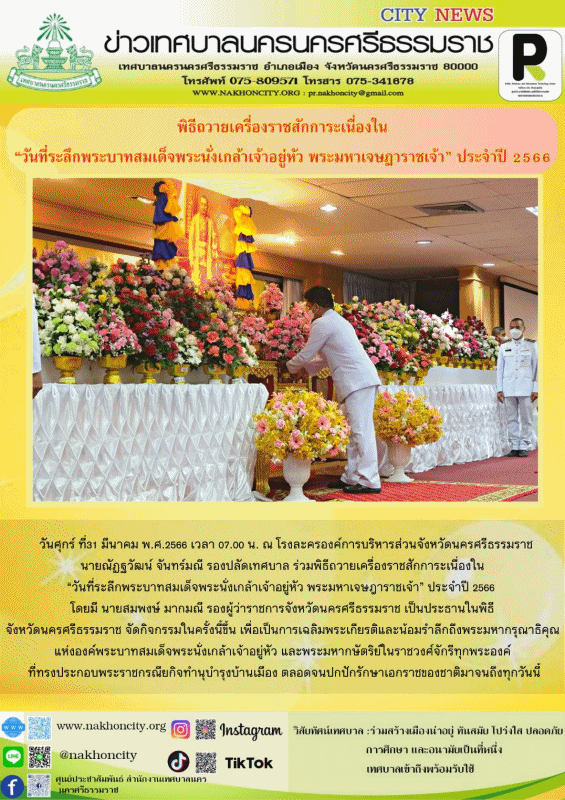 | วันศุกร์ ที่31 มีนาคม พ.ศ.2566 เวลา 07.00 น. ณ หอประชุมโรงละคร องค์การบริหารส่วนจังหวัดนครศรีธรรมราช นายณัฏฐวัฒน์ จันทร์มณี รองปลัดเทศบาล ร่วมพิธีถวายเครื่องราชสักการะเนื่องใน “วันที่ระลึกพระบาทสมเด็จพระนั่งเกล้าเจ้าอยู่หัว พระมหาเจษฎาราชเจ้า” ประจำปี 2566 โดยมี นายสมพงษ์ มากมณี รองผู้ว่าราชการจังหวัดนครศรีธรรมราช เป็นประธานในพิธี จังหวัดนครศรีธรรมราช จัดกิจกรรมในครั้งนี้ขึ้น เพื่อเป็นการเฉลิมพระเกียรติและน้อมรำลึกถึงพระมหากรุณาธิคุณ แห่งองค์พระบาทสมเด็จพระนั่งเกล้าเจ้าอยู่หัว และพระมหากษัตริย์ในราชวงศ์จักรีทุกพระองค์ ที่ทรงประกอบพระราชกรณียกิจทำนุบำรุงบ้านเมือง ตลอดจนปกปักรักษาเอกราชของชาติมาจนถึงทุกวันนี้ ........... ภาพ//ข่าว//จันทร์จิรา |