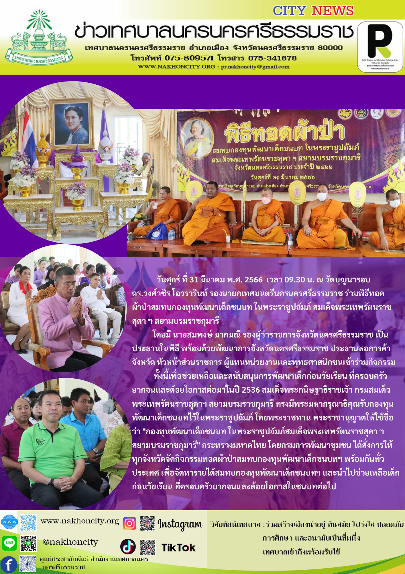 | วันศุกร์ ที่ 31 มีนาคม พ.ศ. 2566 เวลา 09.30 น. ณ วัดบุญนารอบ ดร.วงศ์วชิร โอวรารินท์ รองนายกเทศมนตรีนครนครศรีธรรมราช ร่วมพิธีทอดผ้าป่าสมทบกองทุนพัฒนาเด็กชนบท ในพระราชูปถัมภ์ สมเด็จพระเทพรัตนราชสุดา ฯ สยามบรมราชกุมารี โดยมี นายสมพงษ์ มากมณี รองผู้ว่าราชการจังหวัดนครศรีธรรมราช เป็นประธานในพิธี พร้อมด้วยพัฒนาการจังหวัดนครศรีธรรมราช ประธานหอการค้าจังหวัด หัวหน้าส่วนราชการ ผู้แทนหน่วยงานและพุทธศาสนิกชนเข้าร่วมกิจกรรม ทั้งนี้เพื่อช่วยเหลือและสนับสนุนการพัฒนาเด็กก่อนวัยเรียน ที่ครอบครัวยากจนและด้อยโอกาสต่อมาในปี 2536 สมเด็จพระกนิษฐาธิราชเจ้า กรมสมเด็จพระเทพรัตนราชสุดาฯ สยามบรมราชกุมารี ทรงมีพระมหากรุณาธิคุณรับกองทุนพัฒนาเด็กชนบทไว้ในพระราชูปถัมภ์ โดยพระราชทาน พระราชานุญาตให้ใช้ชื่อว่า "กองทุนพัฒนาเด็กชนบท ในพระราชูปถัมภ์สมเด็จพระเทพรัตนราชสุดา ฯ สยามบรมราชกุมารี" กระทรวงมหาดไทย โดยกรมการพัฒนาชุมชน ได้สั่งการให้ ทุกจังหวัดจัดกิจกรรมทอดผ้าป่าสมทบกองทุนพัฒนาเด็กชนบทฯ พร้อมกันทั่วประเทศ เพื่อจัดหารายได้สมทบกองทุนพัฒนาเด็กชนบทฯ และนำไปช่วยเหลือเด็กก่อนวัยเรียน ที่ครอบครัวยากจนและด้อยโอกาสในชนบทต่อไป |