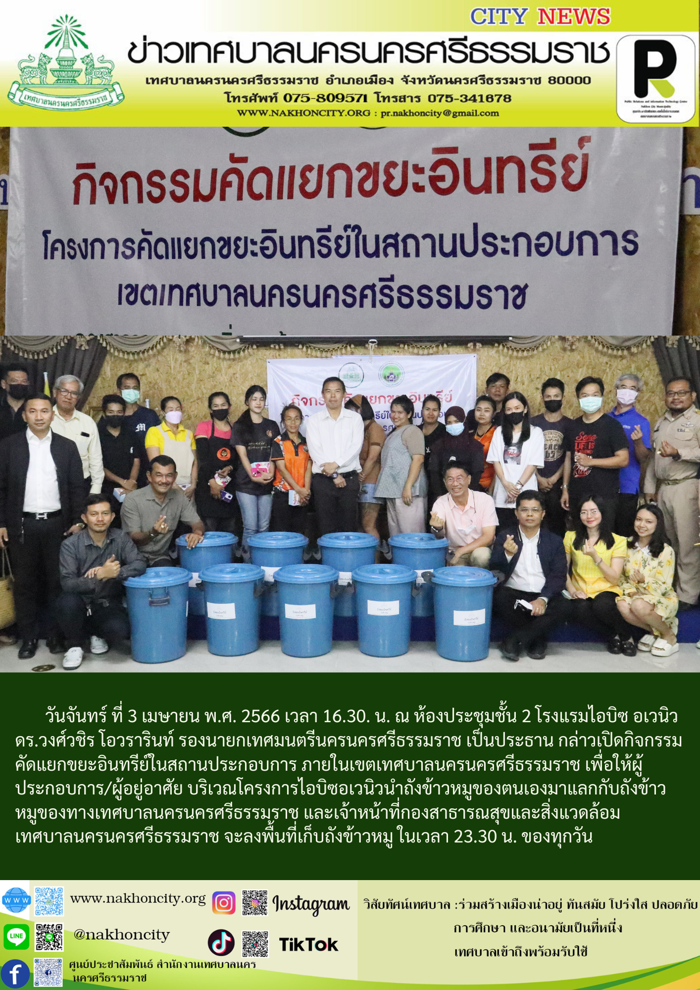 | วันจันทร์ ที่ 3 เมษายน พ.ศ. 2566 เวลา 16.30. น. ณ ห้องประชุมชั้น 2 โรงแรมไอบิซ อเวนิว ดร.วงศ์วชิร โอวรารินท์ รองนายกเทศมนตรีนครนครศรีธรรมราช เป็นประธาน กล่าวเปิดกิจกรรม คัดแยกขยะ อินทรีย์ในสถานประกอบการ ภายในเขตเทศบาลนครนครศรีธรรมราช เพื่อให้ผู้ประกอบการ/ผู้อยู่อาศัย บริเวณโครงการไอบิซอเวนิวนำถังข้าวหมูของตนเองมาแลกกับถังข้าวหมูของทางเทศบาลนครนครศรีธรรมราช และเจ้าหน้าที่กองสาธารณสุขและสิ่งแวดล้อม เทศบาลนครนครศรีธรรมราช จะลงพื้นที่เก็บถังข้าวหมู ในเวลา 23.30 น. ของทุกวัน |