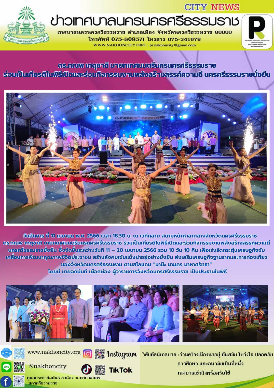 | วันอังคาร ที่ 11 เมษายน พ.ศ. 2566 เวลา 18.30 น. ณ เวทีกลาง สนามหน้าศาลากลางจังหวัดนครศรีธรรมราช ดร.กณพ เกตุชาติ นายกเทศมนตรีนครนครศรีธรรมราช ร่วมเป็นเกียรติในพิธีเปิดและร่วมกิจกรรมงานพลังสร้างสรรค์ความดี นครศรีธรรมราชยั่งยืน ซึ่งจัดขึ้นระหว่างวันที่ 11 – 20 เมษายน 2566 รวม 10 วัน 10 คืน เพื่อเร่งรัดกระตุ้นเศรษฐกิจขับเคลื่อนการพัฒนาคุณภาพชีวิตประชาชน สร้างสังคมเข้มแข็งน่าอยู่อย่างยั่งยืน ส่งเสริมเศรษฐกิจฐานรากและการท่องเที่ยวของจังหวัดนครศรีธรรมราช ตามสโลแกน “มาน๊ะ มานคร มาหาศรัทธา”โดยมี นายอภินันท์ เผือกผ่อง ผู้ว่าราชการจังหวัดนครศรีธรรมราช เป็นประธานในพิธี..............ภาพ//ข่าว//จันทร์จิรา |
