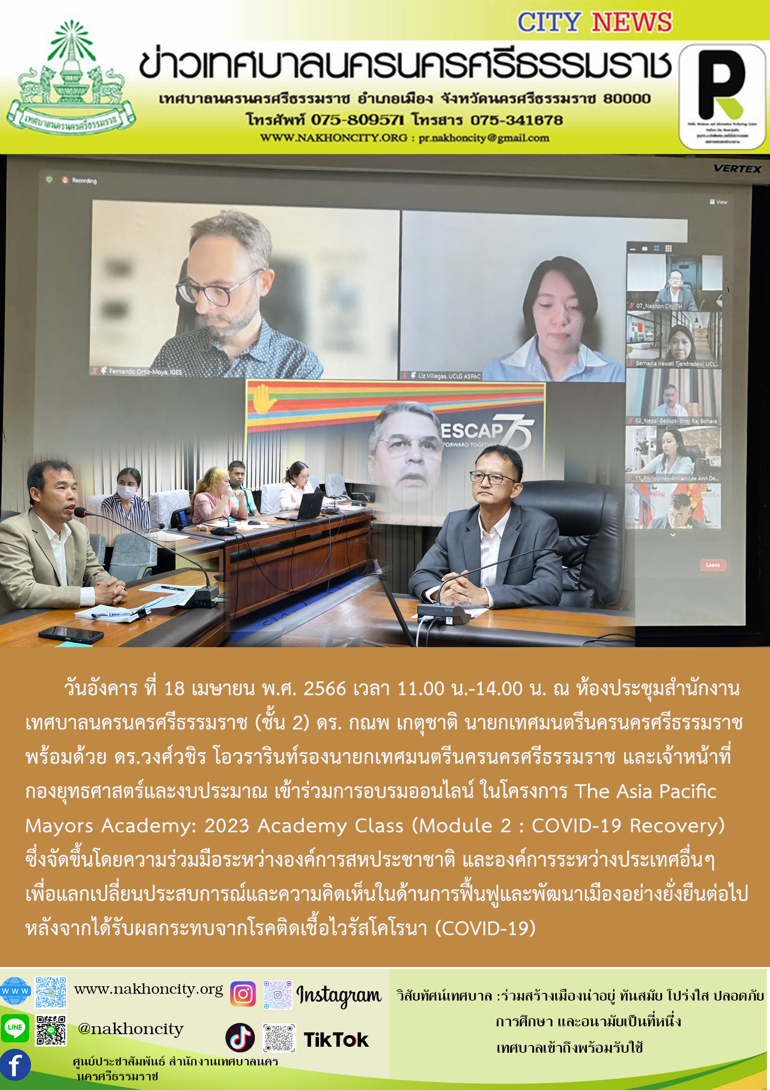 | ดร. กณพ เกตุชาติ นายกเทศมนตรีนครนครศรีธรรมราช พร้อมด้วย ดร.วงศ์วชิร โอวรารินท์รองนายกเทศมนตรีนครนครศรีธรรมราช และเจ้าหน้าที่กองยุทธศาสตร์และงบประมาณ เข้าร่วมการอบรมออนไลน์ ในโครงการ The Asia Pacific Mayors Academy: 2023 Academy Class (Module 2 : COVID-19 Recovery) |