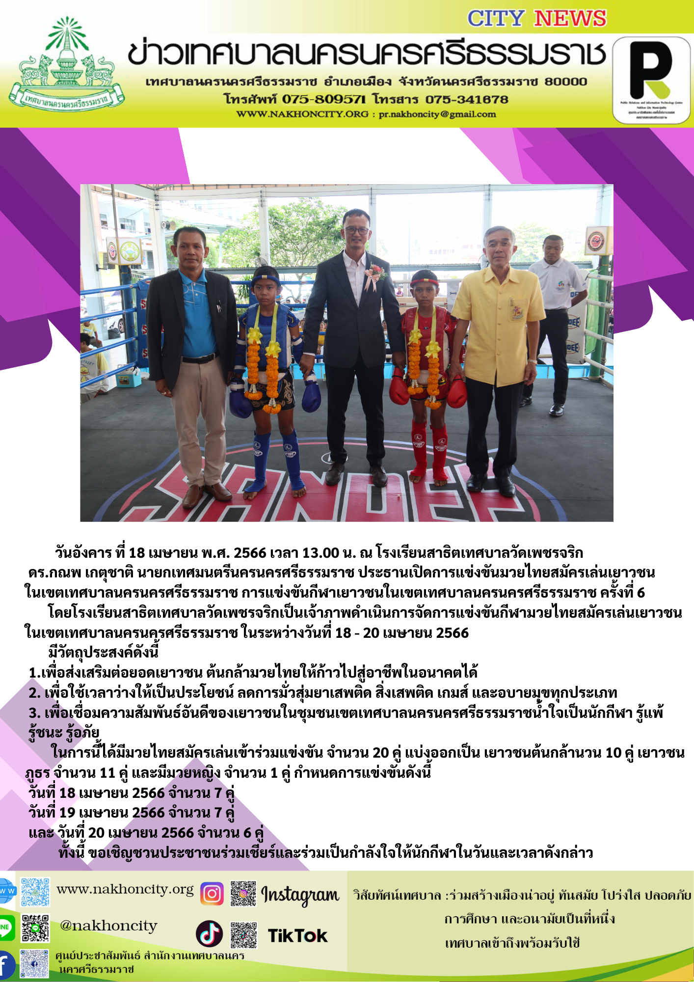 | วันอังคารที่ 18 เมษายน พ.ศ. 2566 เวลา 13.00 น. ณ โรงเรียนสาธิตเทศบาลวัดเพชรจริก ดร.กณพ เกตุชาติ นายกเทศมนตรีนครนครศรีธรรมราช ประธานเปิดการแข่งขันมวยไทยสมัครเล่นเยาวชนในเขตเทศบาลนครนครศรีธรรมราช การแข่งขันกีฬาเยาวชนในเขตเทศบาลนครนครศรีธรรมราช ครั้งที่ 6 โดยโรงเรียนสาธิตเทศบาลวัดเพชรจริกเป็นเจ้าภาพดำเนินการจัดการแข่งขันกีฬามวยไทยสมัครเล่นเยาวชนในเขตเทศบาลนครนครศรีธรรมราช ในระหว่างวันที่ 18 - 20 เมษายน 2566 มีวัตถุประสงค์ดังนี้ 1.เพื่อส่งเสริมต่อยอดเยาวชน ต้นกล้ามวยไทยให้ก้าวไปสู่อาชีพในอนาคตได้ 2. เพื่อใช้เวลาว่างให้เป็นประโยชน์ ลดการมั่วสุ่มยาเสพติด สิ่งเสพติด เกมส์ และอบายมุขทุกประเภท 3. เพื่อเชื่อมความสัมพันธ์อันดีของเยาวชนในชุมชนเขตเทศบาลนครนครศรีธรรมราชน้ำใจเป็นนักกีฬา รู้แพ้ รู้ชนะ รู้อภัย ในการนี้ได้มีมวยไทยสมัครเล่นเข้าร่วมแข่งขัน จำนวน 20 คู่ แบ่งออกเป็น เยาวชนต้นกล้านวน 10 คู่ เยาวชนภูธร จำนวน 11 คู่ และมีมวยหญิง จำนวน 1 คู่ กำหนดการแข่งขันดังนี้ วันที่ 18 เมษายน 2566 จำนวน 7 คู่ วันที่ 19 เมษายน 2566 จำนวน 7 คู่ และ วันที่ 20 เมษายน 2566 จำนวน 6 คู่ ทั้งนี้ ขอเชิญชวนประชาชนร่วมเชียร์และร่วมเป็นกำลังใจให้นักกีฬาในวันและเวลาดังกล่าว |
