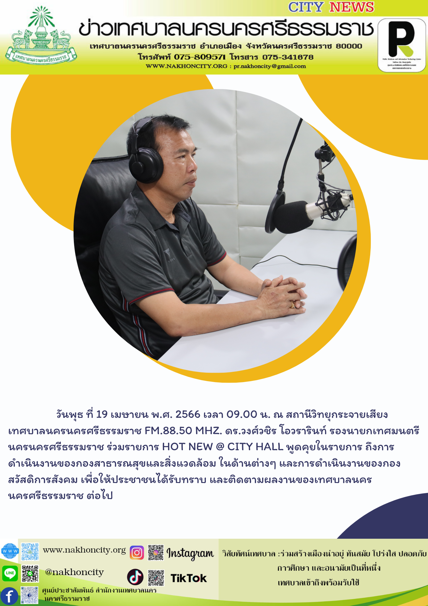 | วันพุธ ที่ 19 เมษายน พ.ศ. 2566 เวลา 09.00 น. ณ สถานีวิทยุกระจายเสียง เทศบาลนครนครศรีธรรมราช FM.88.50 MHz. ดร.วงศ์วชิร โอวรารินท์ รองนายกเทศมนตรีนครนครศรีธรรมราช ร่วมรายการ Hot new @ City Hall พูดคุยในรายการ ถึงการดำเนินงานของกองสาธารณสุขและสิ่งแวดล้อม ในด้านต่างๆ และการดำเนินงานของกองสวัสดิการสังคม เพื่อให้ประชาชนได้รับทราบ และติดตามผลงานของเทศบาลนครนครศรีธรรมราช ต่อไป |