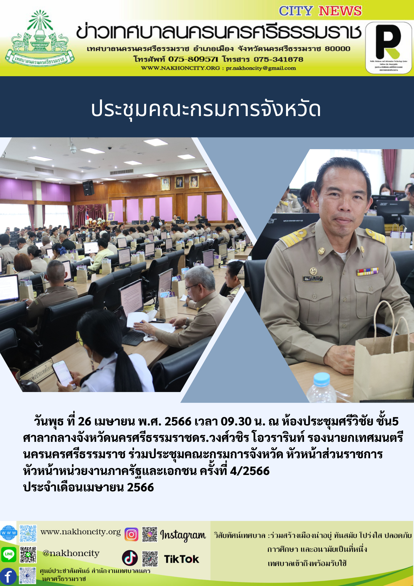 | ดร.วงศ์วชิร โอวรารินท์ รองนายกเทศมนตรีนครนครศรีธรรมราช ร่วมประชุมคณะกรมการจังหวัด หัวหน้าส่วนราชการ หัวหน้าหน่วยงานภาครัฐและเอกชน ครั้งที่ 4/2566 ประจำเดือนเมษายน 2566 |