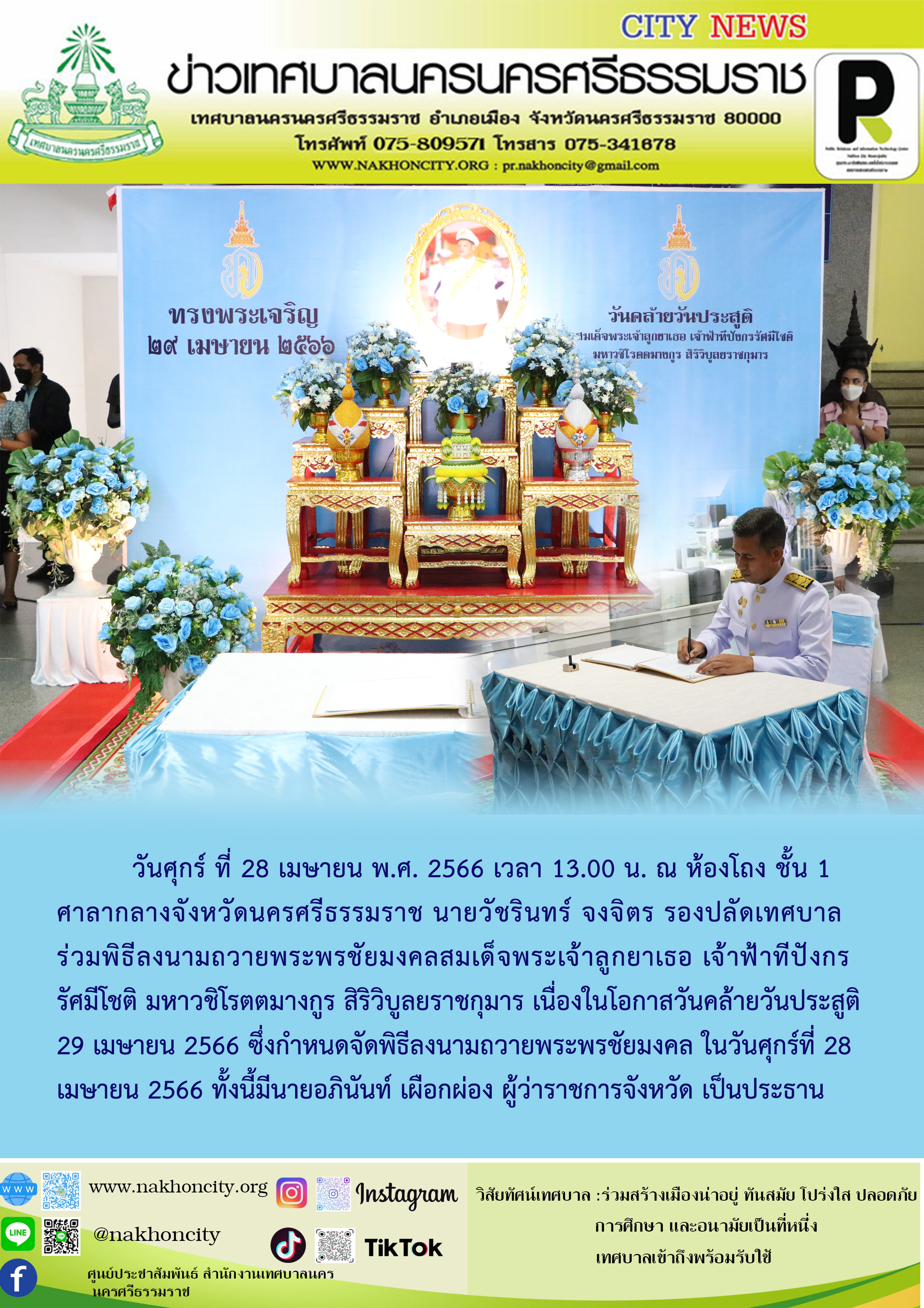 | รองปลัดเทศบาลนครนครศรีธรรมราช ร่วมพิธีลงนามถวายพระพรชัยมงคลสมเด็จพระเจ้าลูกยาเธอ เจ้าฟ้าทีปังกรรัศมีโชติ มหาวชิโรตตมางกูร สิริวิบูลยราชกุมาร เนื่องในโอกาสวันคล้ายวันประสูติ 29 เมษายน 2566 |