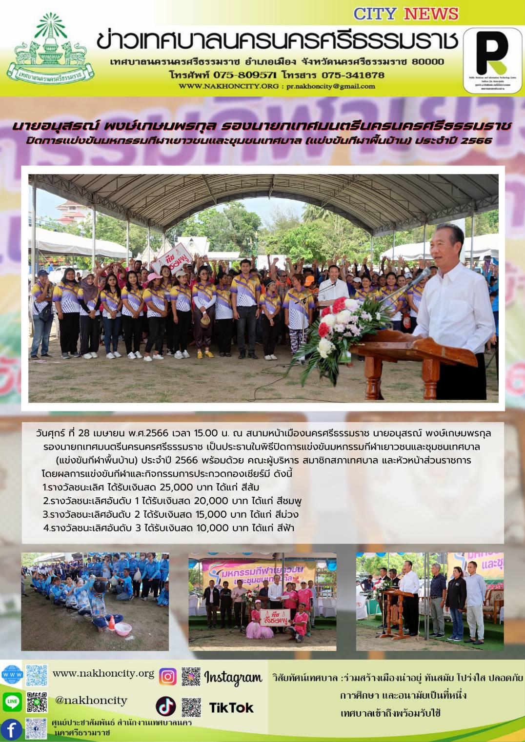 | วันศุกร์ ที่ 28 เมษายน พ.ศ.2566 เวลา 15.00 น. ณ สนามหน้าเมืองนครศรีธรรมราช นายอนุสรณ์ พงษ์เกษมพรกุล รองนายกเทศมนตรีนครนครศรีธรรมราช เป็นประธานในพิธีปิดการแข่งขันมหกรรมกีฬาเยาวชนและชุมชนเทศบาล (แข่งขันกีฬาพื้นบ้าน) ประจำปี 2566 พร้อมด้วย คณะผู้บริหาร สมาชิกสภาเทศบาล และหัวหน้าส่วนราชการ โดยผลการแข่งขันกีฬาและกิจกรรมการประกวดกองเชียร์มี ดังนี้
