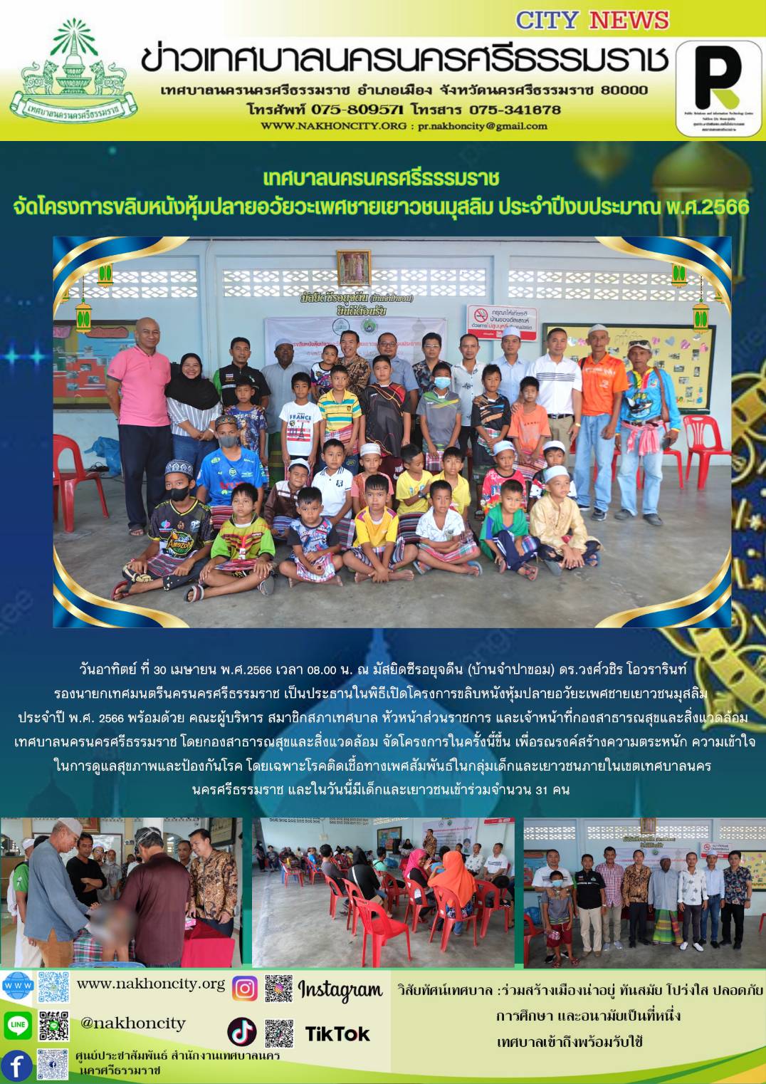 | วันอาทิตย์ ที่ 30 เมษายน พ.ศ.2566 เวลา 08.00 น. ณ มัสยิดซีรอยุจดีน (บ้านจำปาขอม) ดร.วงศ์วชิร โอวรารินท์ รองนายกเทศมนตรีนครนครศรีธรรมราช เป็นประธานในพิธีเปิดโครงการขลิบหนังหุ้มปลายอวัยะเพศชายเยาวชนมุสลิม ประจำปี พ.ศ. 2566 พร้อมด้วย คณะผู้บริหาร สมาชิกสภาเทศบาล หัวหน้าส่วนราชการ และเจ้าหน้าที่กองสาธารณสุขและสิ่งแวดล้อม เทศบาลนครนครศรีธรรมราช โดยกองสาธารณสุขและสิ่งแวดล้อม จัดโครงการในครั้งนี้ขึ้น เพื่อรณรงค์สร้างความตระหนัก ความเข้าใจในการดูแลสุขภาพและป้องกันโรค โดยเฉพาะโรคติดเชื้อทางเพศสัมพันธ์ในกลุ่มเด็กและเยาวชนภายในเขตเทศบาลนครนครศรีธรรมราช และในวันนี้มีเด็กและเยาวชนเข้าร่วมจำนวน 31 คน ............. ภาพ//ข่าว//จันทร์จิรา |