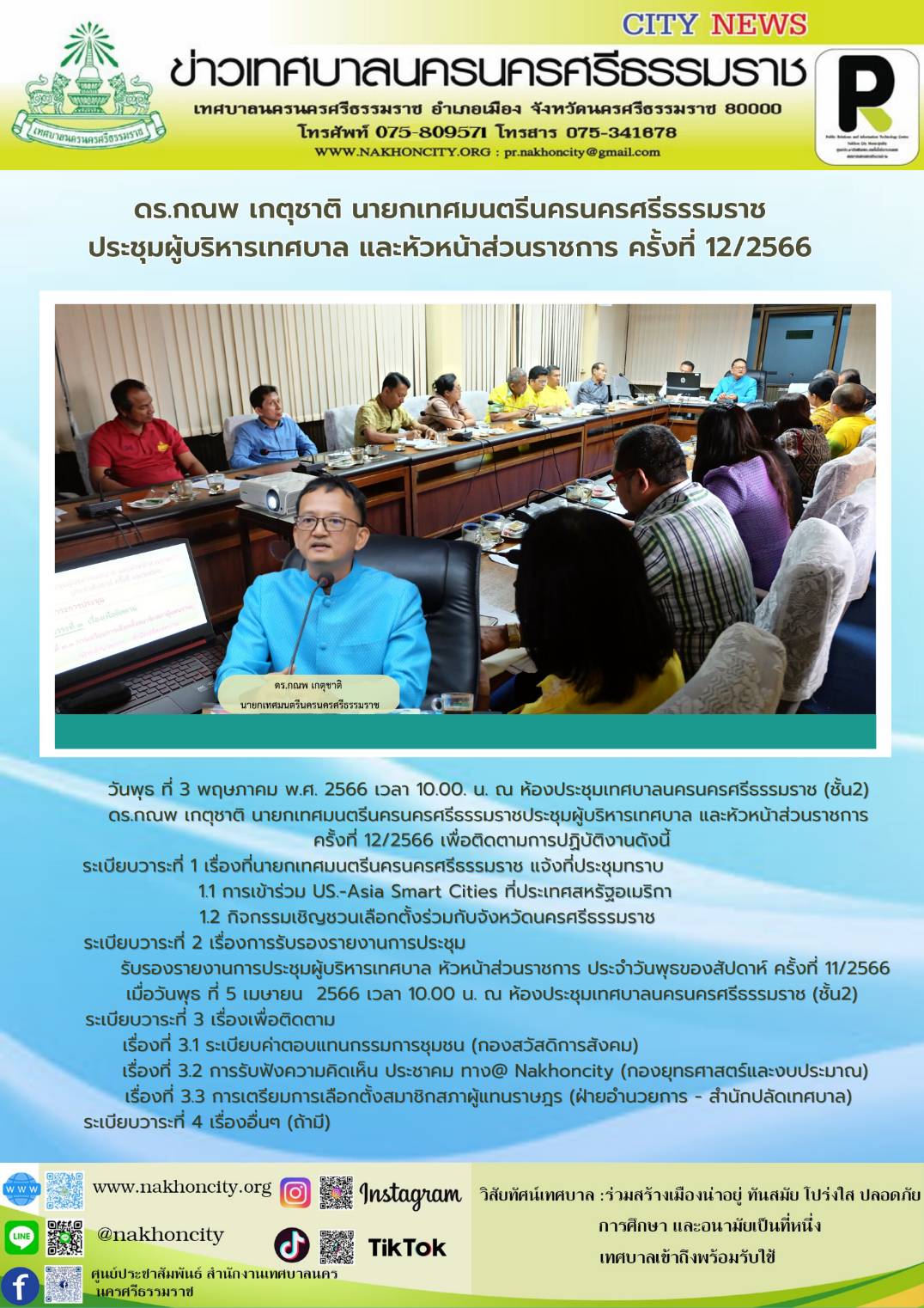 | ดร.กณพ เกตุชาติ นายกเทศมนตรีนครนครศรีธรรมราช ประชุมผู้บริหารเทศบาล และหัวหน้าส่วนราชการ ครั้งที่ 12/2566 |