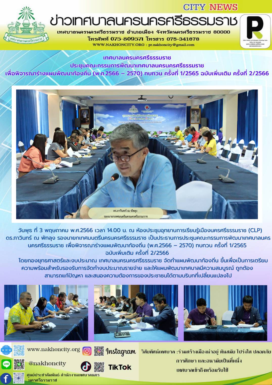 | เทศบาลนครนครศรีธรรมราช ประชุมคณะกรรมการพัฒนาเทศบาลนครนครศรีธรรมราช เพื่อพิจารณาร่างแผนพัฒนาท้องถิ่น (พ.ศ.2566 – 2570) ทบทวน ครั้งที่ 1/2565 ฉบับเพิ่มเติม ครั้งที่ 2/2566 |
