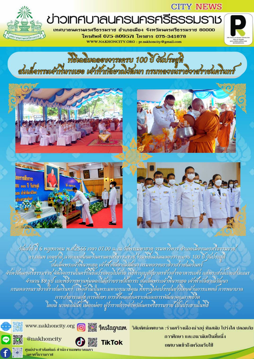 | วันเสาร์ ที่ 6 พฤษภาคม พ.ศ.2566 เวลา 07.00 น. ณ วัดพระมหาธาตุ วรมหาวิหาร อำเภอเมืองนครศรีธรรมราช ดร.กณพ เกตุชาติ นายกเทศมนตรีนครนครศรีธรรมราช ร่วมพิธีเฉลิมฉลองวาระครบ 100 ปี วันประสูติ สมเด็จพระเจ้าพี่นางเธอ เจ้าฟ้ากัลยาณิวัฒนา กรมหลวงนราธิวาสราชนครินทร์ จังหวัดนครศรีธรรมราช จัดกิจกรรมในครั้งนี้ขึ้นประกอบไปด้วย พิธีทำบุญตักบาตรข้าวสารอาหารแห้ง แด่พระสงฆ์และสามเณร จำนวน 89 รูป และพิธีวางพานพุ่มดอกไม้ถวายราชสักการะ สมเด็จพระเจ้าพี่นางเธอ เจ้าฟ้ากัลยาณิวัฒนา กรมหลวงนราธิวาสราชนครินทร์ เพื่อสำนึกในพระมหากรุณาธิคุณ ที่ทรงมีต่อปวงชนชาวไทยด้านการแพทย์ การพยาบาล การสาธารณสุข การศึกษา การสังคมสงเคราะห์และการพัฒนาคุณภาพชีวิต โดยมี นายอภินันท์ เผือกผ่อง ผู้ว่าราชการจังหวัดนครศรีธรรมราช เป็นประธานในพิธี …………….. ภาพ//ข่าว//จันทร์จิรา |