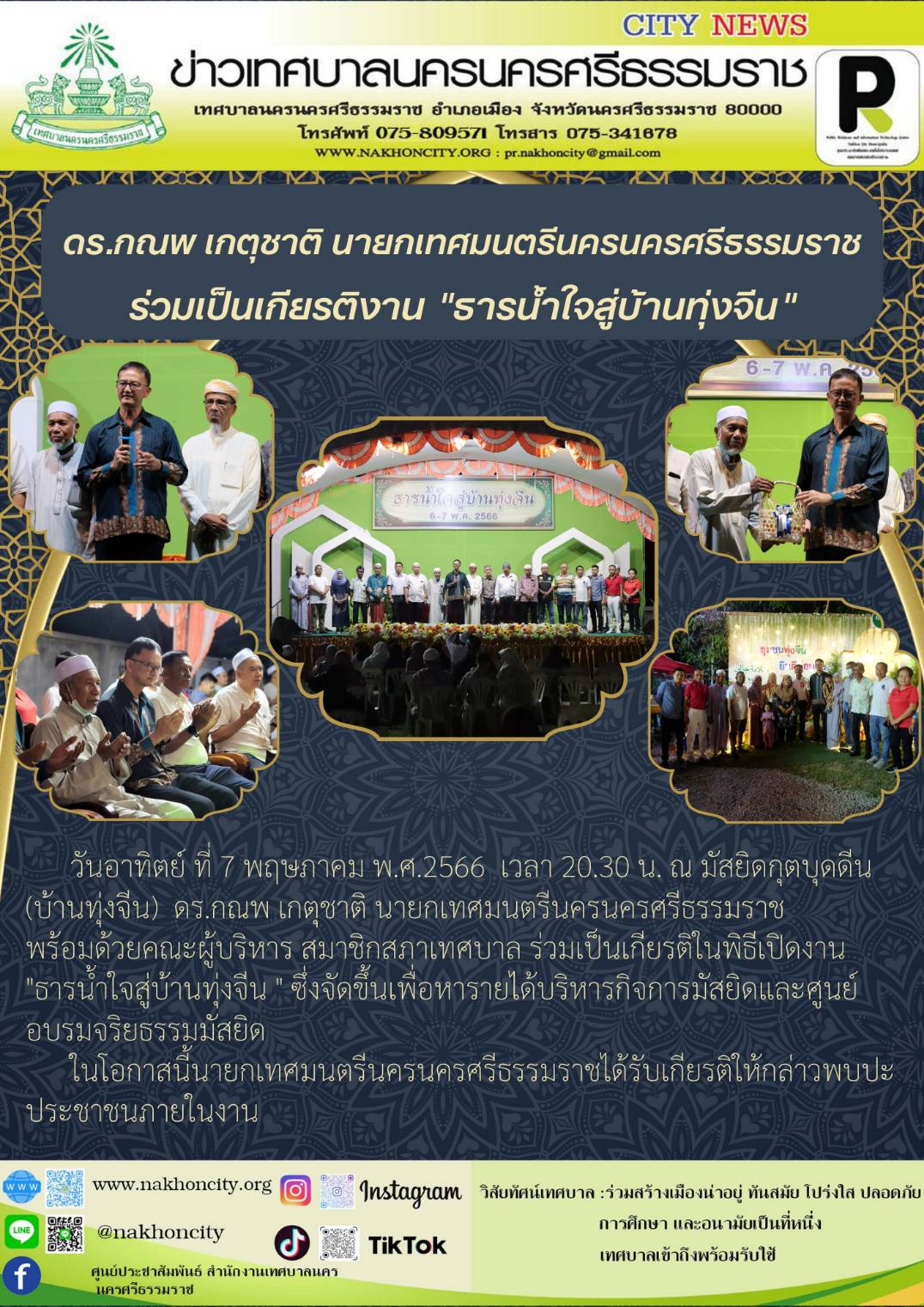 | วันอาทิตย์ ที่ 7 พฤษภาคม พ.ศ.2566  เวลา 20.30 น. ณ มัสยิดกุตบุดดีน (บ้านทุ่งจีน)  ดร.กณพ เกตุชาติ นายกเทศมนตรีนครนครศรีธรรมราช พร้อมด้วยคณะผู้บริหาร สมาชิกสภาเทศบาล  ร่วมเป็นเกียรติในพิธีเปิดงาน "ธารน้ำใจสู่บ้านทุ่งจีน ซึ่งจัดขึ้นเพื่อหารายได้บริหารกิจการมัสยิดและศูนย์อบรมจริยธรรมมัสยิด   |