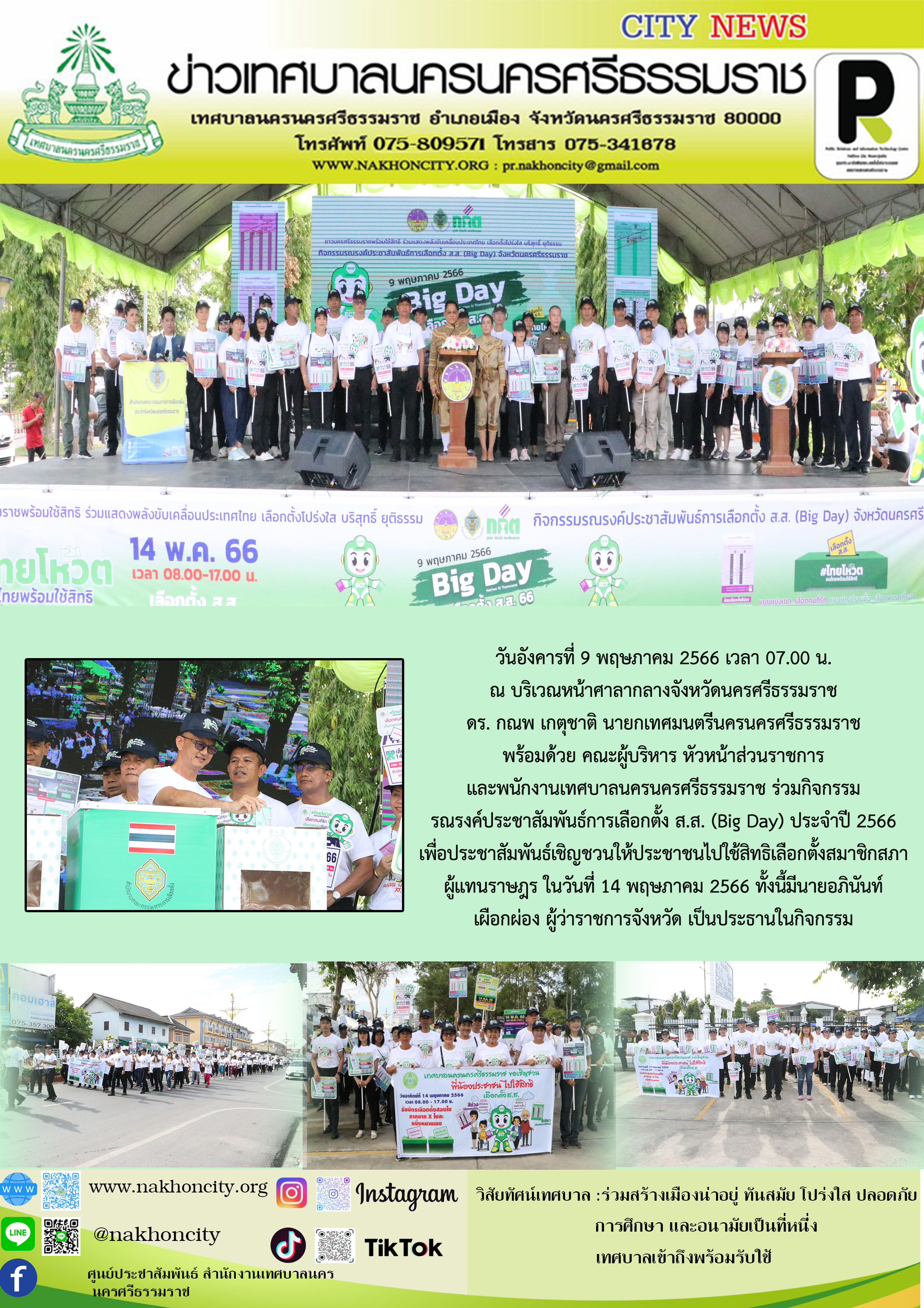 | ดร. กณพ เกตุชาติ นายกเทศมนตรีนครนครศรีธรรมราช พร้อมด้วย คณะผู้บริหาร หัวหน้าส่วนราชการ และพนักงานเทศบาลนครนครศรีธรรมราช ร่วมกิจกรรม รณรงค์ประชาสัมพันธ์การเลือกตั้ง ส.ส. (Big Day) ประจำปี 2566 |