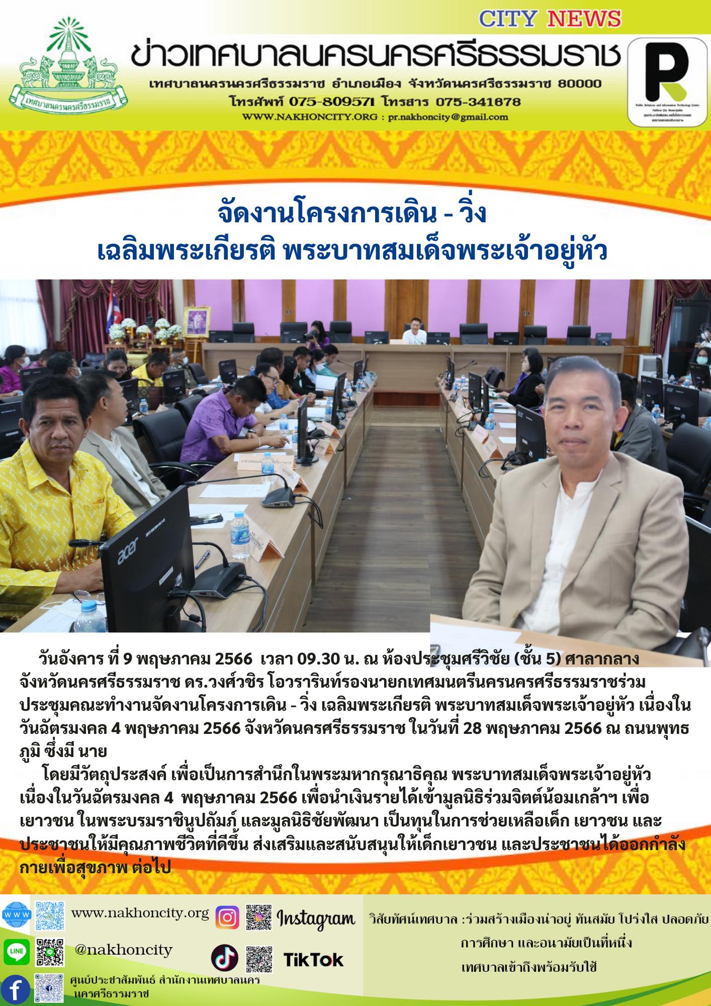 | วันอังคาร ที่ 9 พฤษภาคม 2566 เวลา 09.30 น. ณ ห้องประชุมศรีวิชัย (ชั้น 5) ศาลากลางจังหวัด นครศรีธรรมราช ดร.วงศ์วชิร โอวรารินท์ รองนายกเทศมนตรีนครนครศรีธรรมราช ร่วมประชุมคณะทำงานจัดงานโครงการเดิน - วิ่ง เฉลิมพระเกียรติ พระบาทสมเด็จพระเจ้าอยู่หัว เนื่องในวันฉัตรมงคล 4 พฤษภาคม 2566 จังหวัดนครศรีธรรมราช ในวันที่ 28 พฤษภาคม 2566 ณ ถนนพุทธภูมิ ซึ่งมี นายศรัทธา ทองคำ รองผู้ว่าราชการจังหวัดนครศรีธรรมราช เป็นประธานการประชุม โดยมีวัตถุประสงค์ เพื่อเป็นการสำนึกในพระมหากรุณาธิคุณ พระบาทสมเด็จพระเจ้าอยู่หัว เนื่องในวันฉัตรมงคล 4 พฤษภาคม 2566 เพื่อนำเงินรายได้เข้ามูลนิธิร่วมจิตต์น้อมเกล้าฯ เพื่อเยาวชน ในพระบรมราชินูปถัมภ์ และมูลนิธิชัยพัฒนา เป็นทุนในการช่วยเหลือเด็ก เยาวชน และประชาชนให้มีคุณภาพชีวิตที่ดีขึ้น ส่งเสริมและสนับสนุนให้เด็กเยาวชน และประชาชนได้ออกกำลังกายเพื่อสุขภาพ ต่อไป |