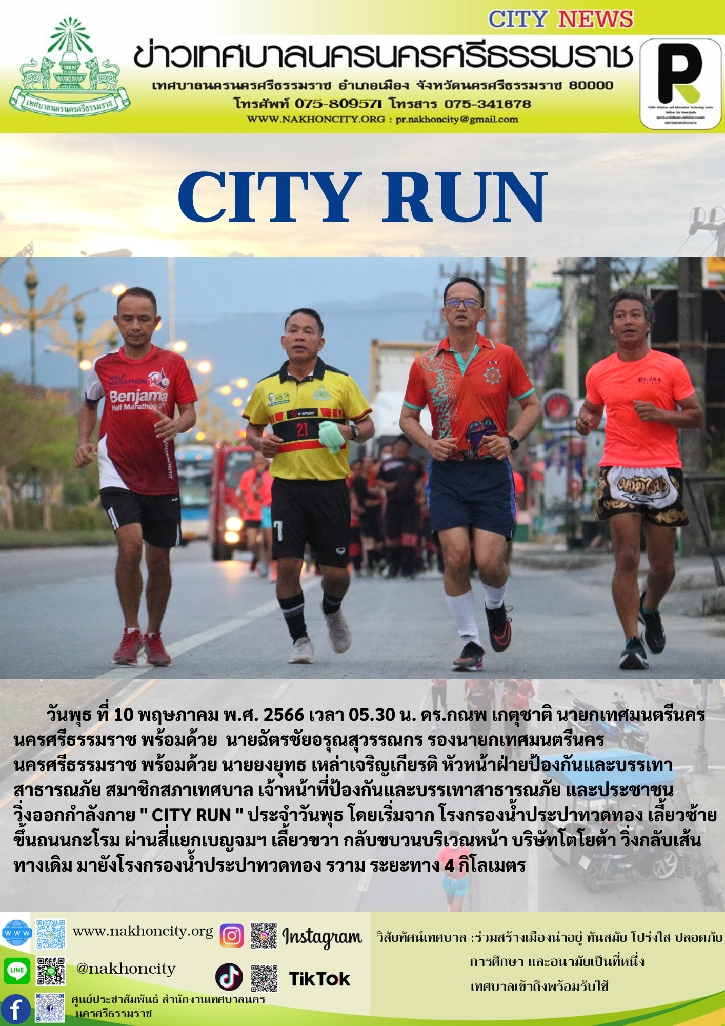 | วันพุธ ที่ 10 พฤษภาคม พ.ศ. 2566 เวลา 05.30 น. ดร.กณพ เกตุชาติ นายกเทศมนตรีนครนครศรีธรรมราช พร้อมด้วย นายฉัตรชัย อรุณสุวรรณกร รองนายกเทศมนตรีนครนครศรีธรรมราช พร้อมด้วย นายยงยุทธ เหล่าเจริญเกียรติ หัวหน้าฝ่ายป้องกันและบรรเทาสาธารณภัย สมาชิกสภาเทศบาล เจ้าหน้าที่ป้องกันและบรรเทาสาธารณภัย และประชาชน วิ่งออกกำลังกาย " CITY RUN " ประจำวันพุธ โดยเริ่มจาก โรงกรองน้ำประปาทวดทอง เลี้ยวซ้ายขึ้นถนนกะโรม ผ่านสี่แยกเบญจมฯ เลี้ยวขวา กลับขบวนบริเวณหน้า บริษัทโตโยต้า วิ่งกลับเส้นทางเดิม มายังโรงกรองน้ำประปาทวดทอง รวาม ระยะทาง 4 กิโลเมตร ภาพ/ข่าว/แสงจันทร์