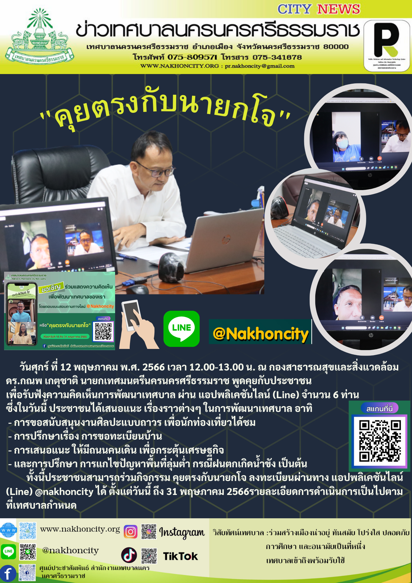 | วันศุกร์ ที่ 12 พฤษภาคม พ.ศ. 2566 เวลา 12.00-13.00 น. ดร.กณพ เกตุชาติ นายกเทศมนตรีนครนครศรีธรรมราช พูดคุยกับประชาชน เพื่อรับฟังความคิดเห็นการพัฒนาเทศบาล ผ่าน แอปพลิเคชันไลน์ (Line) จำนวน 6 ท่าน ซึ่งในวันนี้ ประชาชนได้เสนอแนะ เรื่องราวต่างๆ ในการพัฒนาเทศบาล อาทิ
