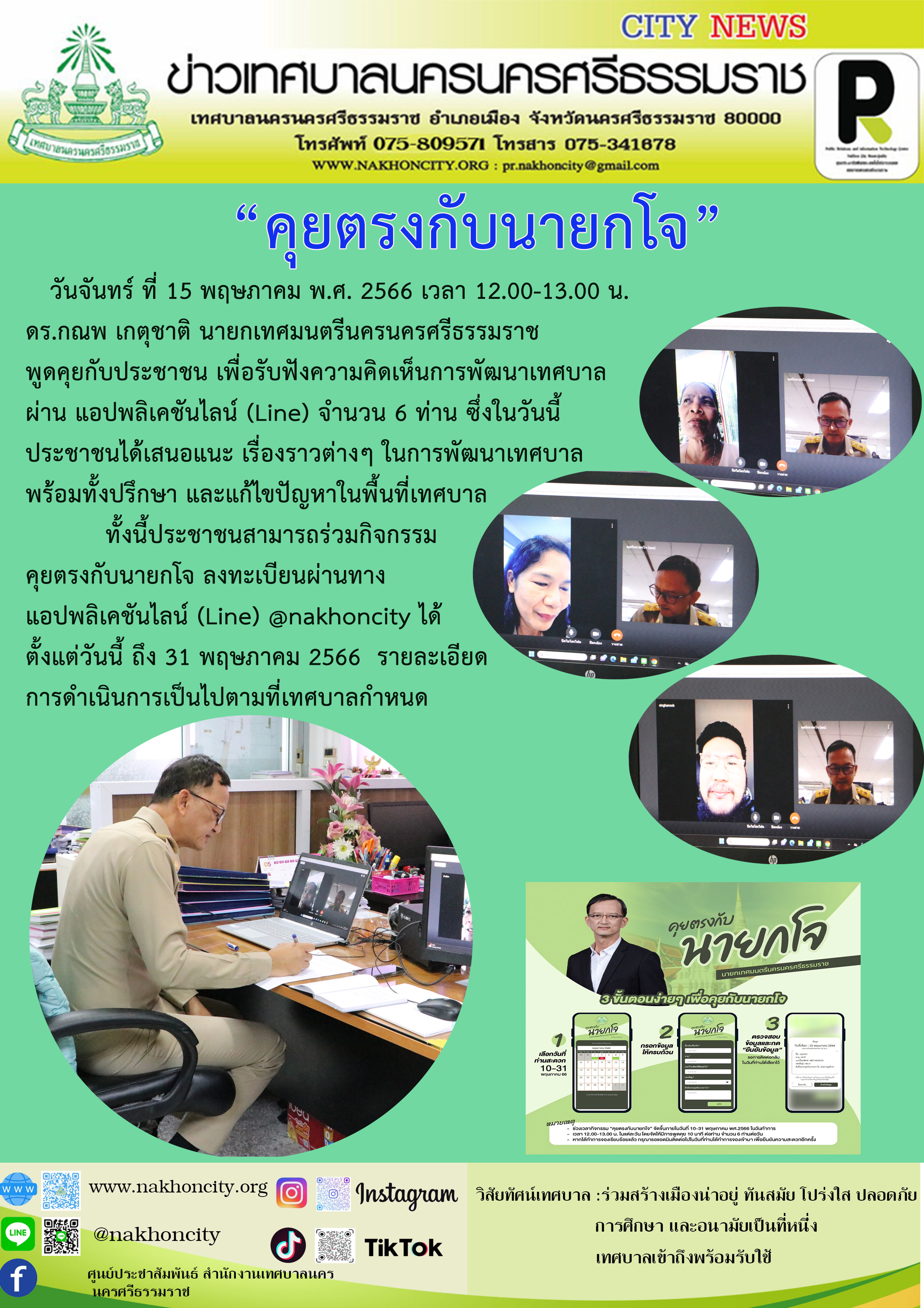 | วันจันทร์ ที่ 15 พฤษภาคม พ.ศ. 2566 เวลา 12.00-13.00 น. ดร.กณพ เกตุชาติ นายกเทศมนตรีนครนครศรีธรรมราช พูดคุยกับประชาชน เพื่อรับฟังความคิดเห็นการพัฒนาเทศบาล ผ่าน แอปพลิเคชันไลน์ (Line) จำนวน 6 ท่าน ซึ่งในวันนี้ ประชาชนได้เสนอแนะ เรื่องราวต่างๆ ในการพัฒนาเทศบาล พร้อมทั้งปรึกษา และแก้ไขปัญหาในพื้นที่เทศบาล