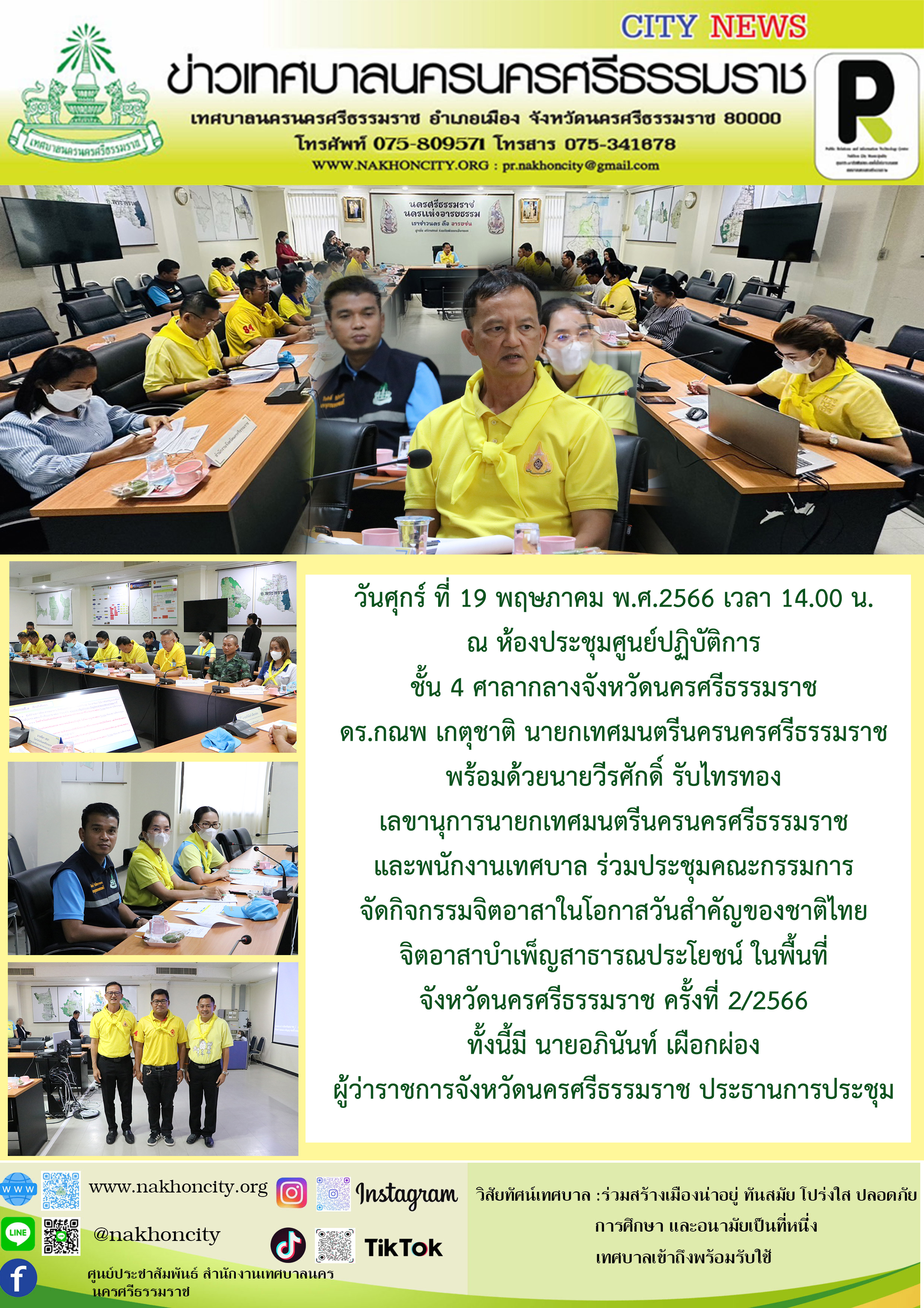 | ดร.กณพ เกตุชาติ นายกเทศมนตรีนครนครศรีธรรมราช พร้อมด้วยนายวีรศักดิ์ รับไทรทอง เลขานุการนายกเทศมนตรีนครนครศรีธรรมราช และพนักงานเทศบาล ร่วมประชุมคณะกรรมการจัดกิจกรรมจิตอาสาในโอกาสวันสำคัญของชาติไทย จิตอาสาบำเพ็ญสาธารณประโยชน์ ในพื้นที่จังหวัดนครศรีธรรมราช ครั้งที่ 2/2566 |