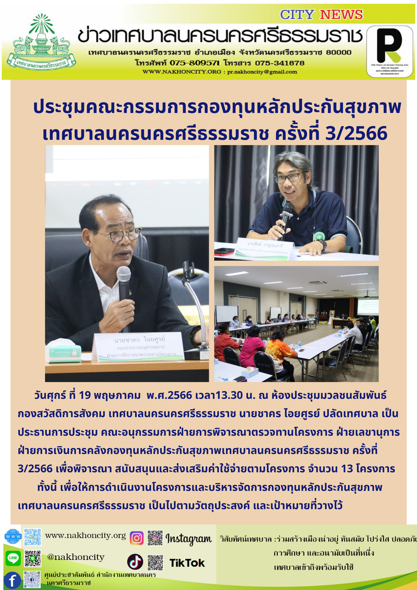 | วันศุกร์ ที่ 19 พฤษภาคม พ.ศ.2566 เวลา 13.30 น. ณ ห้องประชุมมวลชนสัมพันธ์ กองสวัสดิการสังคม เทศบาลนครนครศรีธรรมราช นายชาคร ไอยศูรย์ ปลัดเทศบาล เป็นประธานการประชุม คณะอนุกรรมการฝ่ายการพิจารณาตรวจทานโครงการ ฝ่ายเลขานุการ ฝ่ายการเงินการคลังกองทุนหลักประกันสุขภาพเทศบาลนครนครศรีธรรมราช ครั้งที่ 3/2566 เพื่อพิจารณา สนับสนุนและส่งเสริมค่าใช้จ่ายตามโครงการ จำนวน 13โครงการ ทั้งนี้ เพื่อให้การดำเนินงานโครงการและบริหารจัดการกองทุนหลักประกันสุขภาพ เทศบาลนครนครศรีธรรมราช เป็นไปตามวัตถุประสงค์ และเป้าหมายที่วางไว้ |