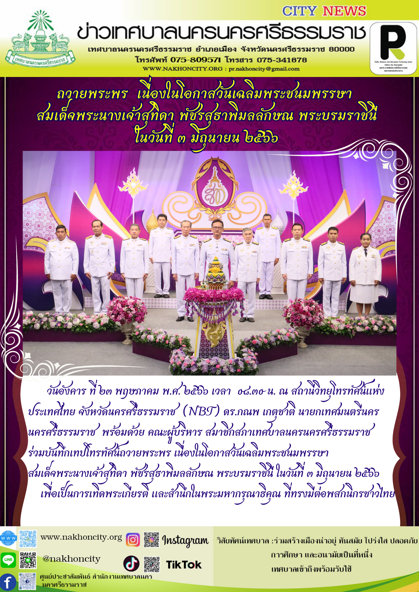 | เทศบาลนครนครศรีธรรมราช ร่วมบันทึกเทปโทรทัศน์ถวายพระพร เนื่องในโอกาสวันเฉลิมพระชนมพรรษา สมเด็จพระนางเจ้าสุทิดา พัชรสุธาพิมลลักษณ พระบรมราชินี ในวันที่ 3 มิถุนายน 2566
