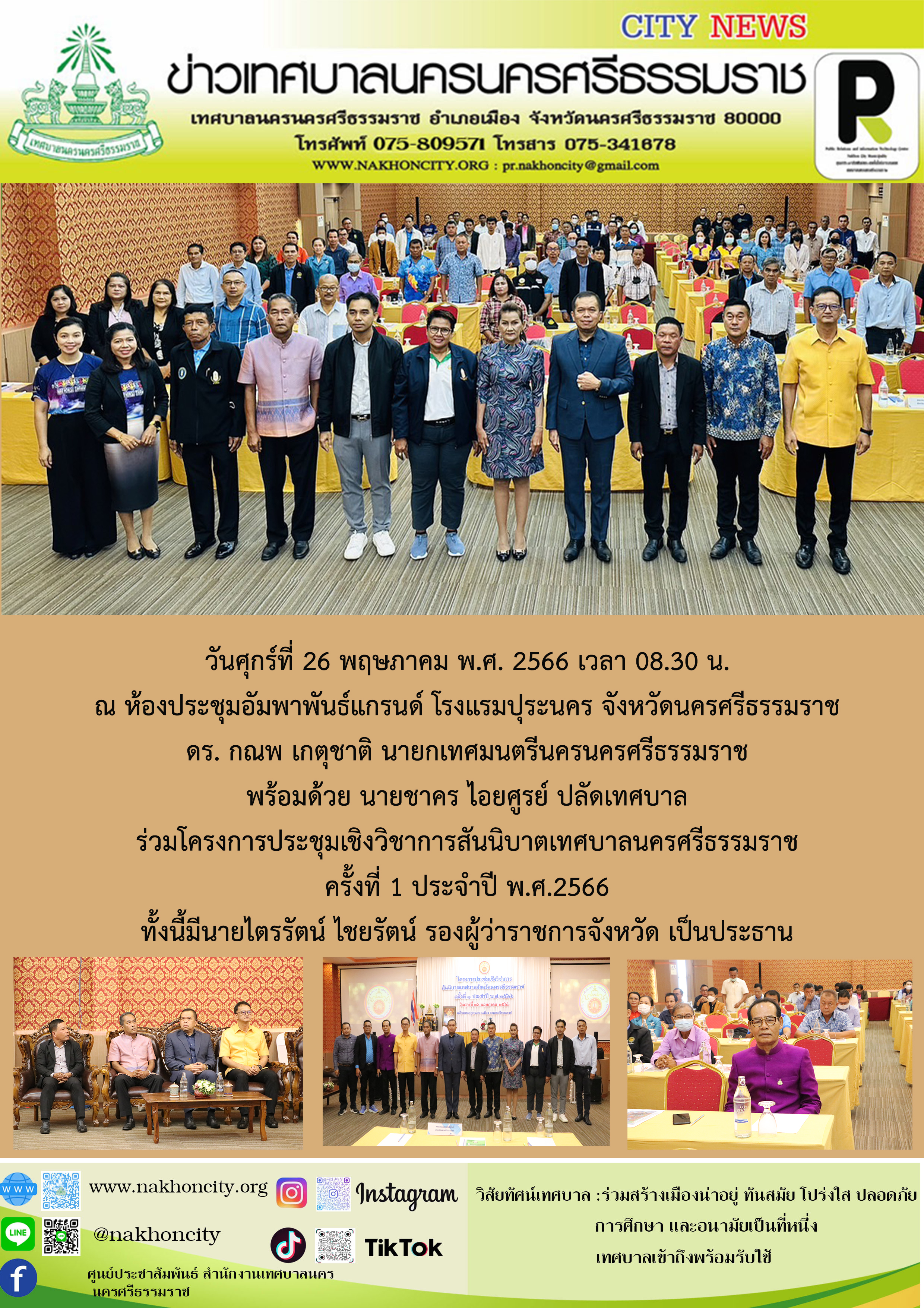 | ดร. กณพ เกตุชาติ นายกเทศมนตรีนครนครศรีธรรมราช พร้อมด้วย นายชาคร ไอยศูรย์ ปลัดเทศบาล ร่วมโครงการประชุมเชิงวิชาการสันนิบาตเทศบาลนครศรีธรรมราช ครั้งที่ 1 ประจำปี พ.ศ.2566 |