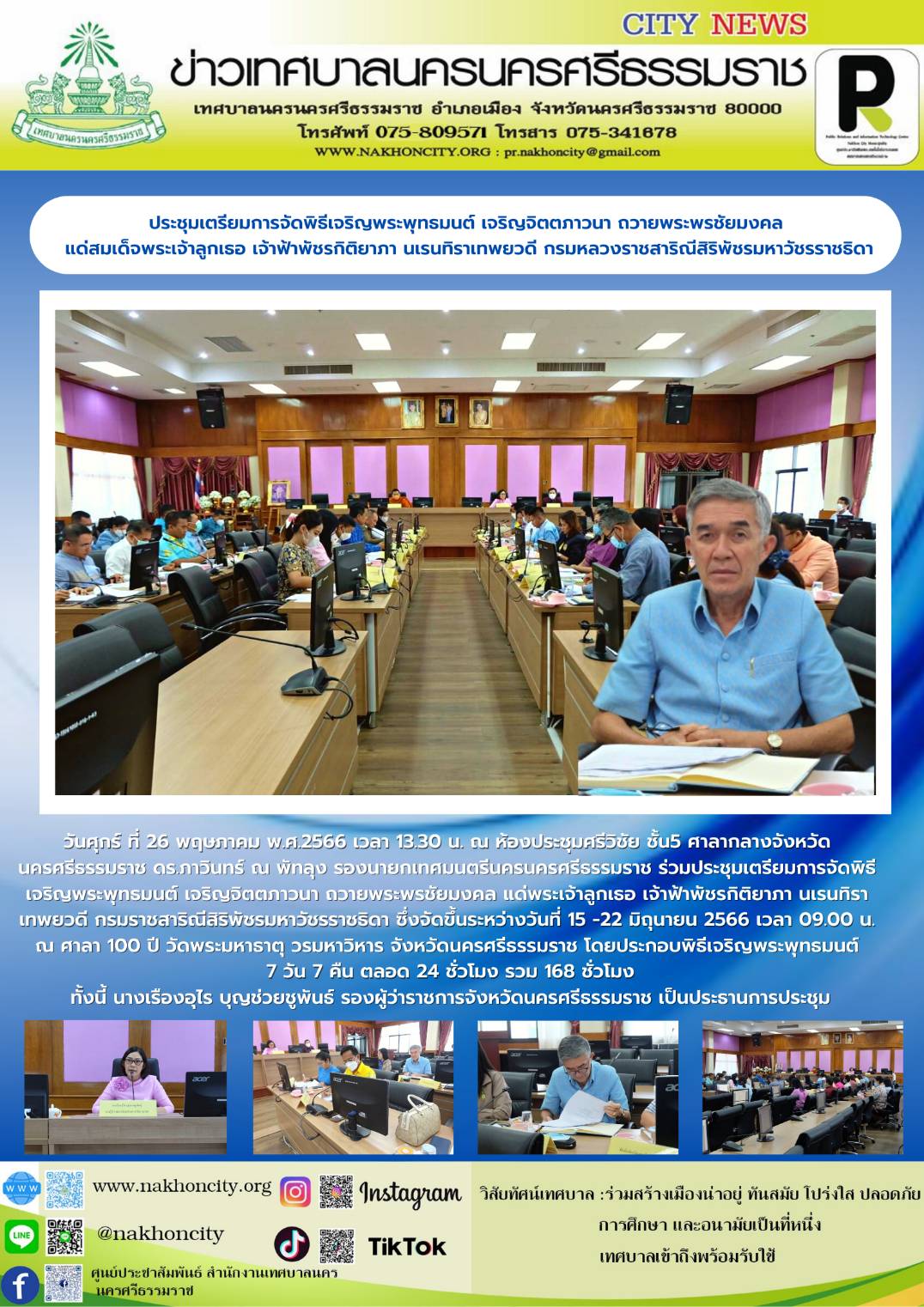 | วันศุกร์ ที่ 26 พฤษภาคม พ.ศ.2566 เวลา 13.30 น. ณ ห้องประชุมศรีวิชัย ชั้น5 ศาลากลางจังหวัดนครศรีธรรมราช ดร.ภาวินทร์ ณ พัทลุง รองนายกเทศมนตรีนครนครศรีธรรมราช ร่วมประชุมเตรียมการจัดพิธีเจริญพระพุทธมนต์ เจริญจิตตภาวนา ถวายพระพรชัยมงคล แด่พระเจ้าลูกเธอ เจ้าฟ้าพัชรกิติยาภา นเรนทิราเทพยวดี กรมราชสาริณีสิริพัชรมหาวัชรราชธิดา ซึ่งจัดขึ้นระหว่างวันที่ 15 -22 มิถุนายน 2566 เวลา 09.00 น. ณ ศาลา 100 ปี วัดพระมหาธาตุ วรมหาวิหาร จังหวัดนครศรีธรรมราช โดยประกอบพิธีเจริญพระพุทธมนต์ 7 วัน 7 คืน ตลอด 24 ชั่วโมง รวม 168 ชั่วโมง |