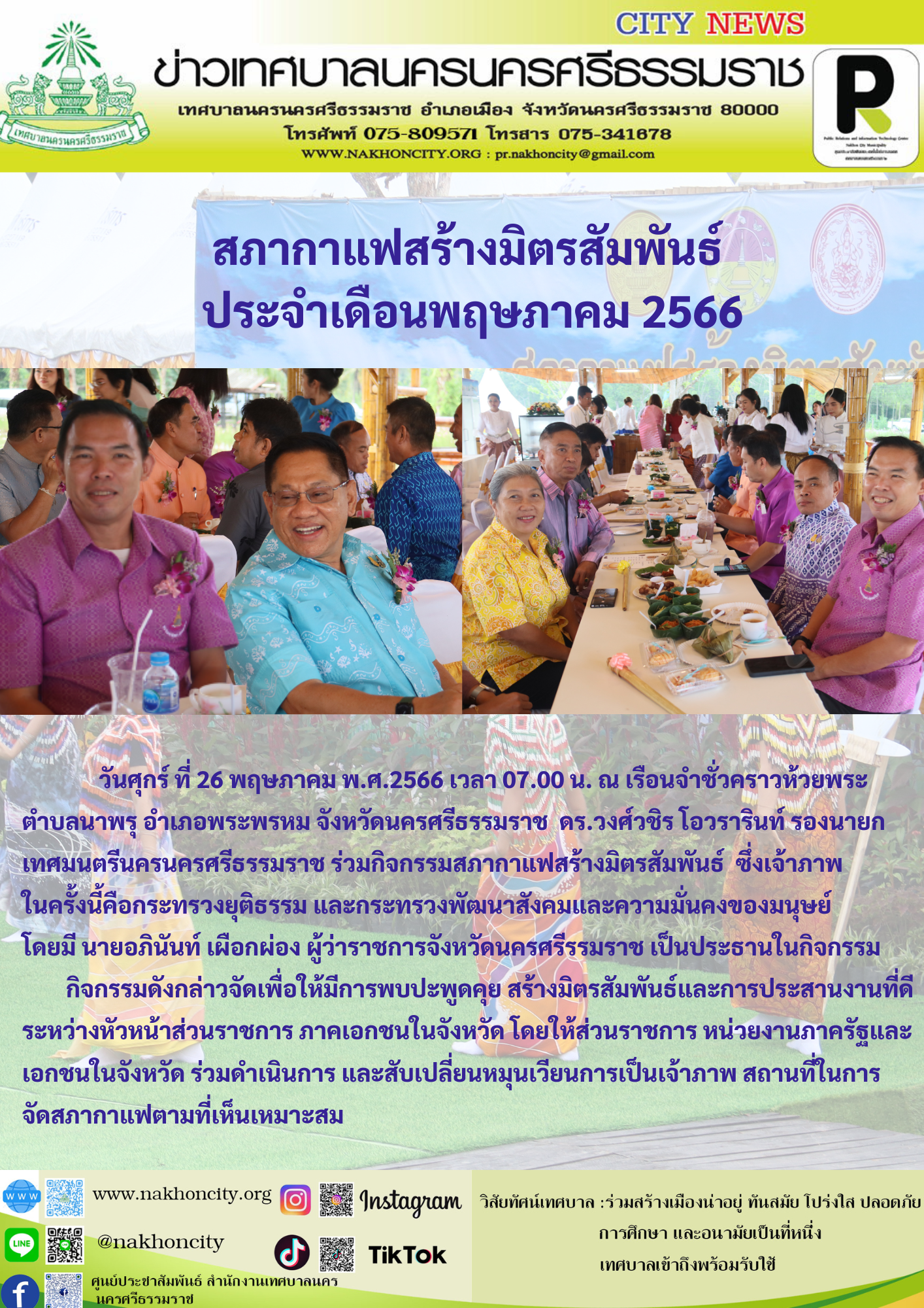 | ดร.วงศ์วชิร โอวรารินท์ รองนายกเทศมนตรีนครนครศรีธรรมราช ร่วมกิจกรรมสภากาแฟสร้างมิตรสัมพันธ์ ประจำเดือนพฤษภาคม 2566 |