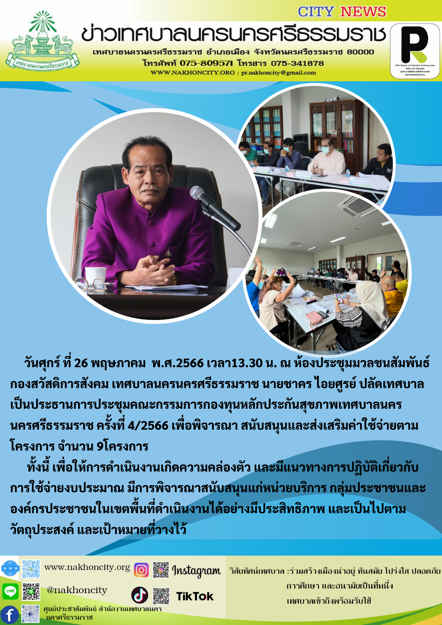 | นายชาคร ไอยศูรย์ ปลัดเทศบาล เป็นประธานการประชุมคณะกรรมการกองทุนหลักประกันสุขภาพเทศบาลนครนครศรีธรรมราช ครั้งที่ 4/2566 |