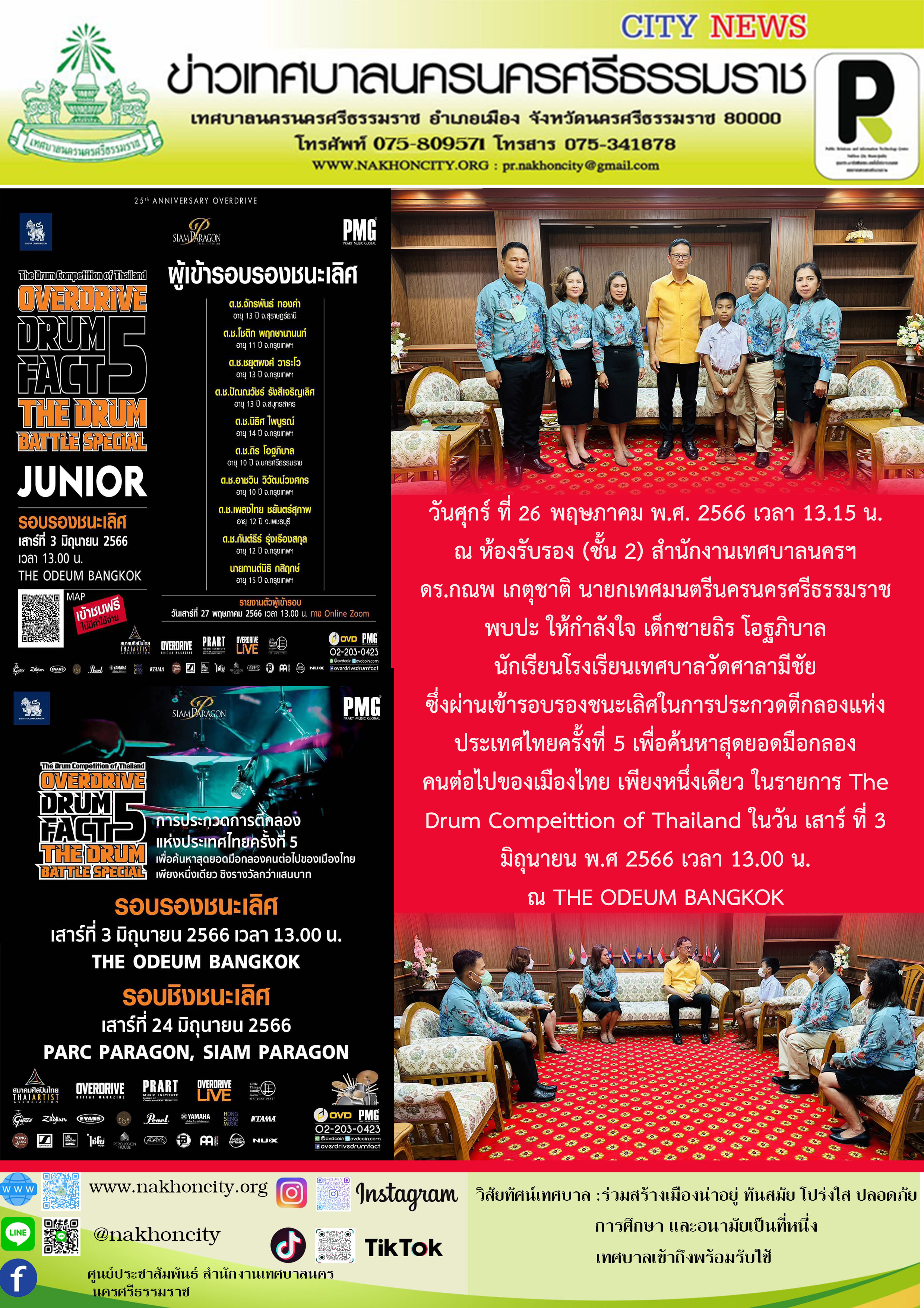 | ดร.กณพ เกตุชาติ นายกเทศมนตรีนครนครศรีธรรมราช พบปะ ให้กำลังใจ เด็กชายถิร โอฐภิบาล นักเรียนโรงเรียนเทศบาลวัดศาลามีชัย ซึ่งผ่านเข้ารอบรองชนะเลิศในการประกวดตีกลองแห่งประเทศไทยครั้งที่ 5 ในรายการ The Drum Compeittion of Thailand |