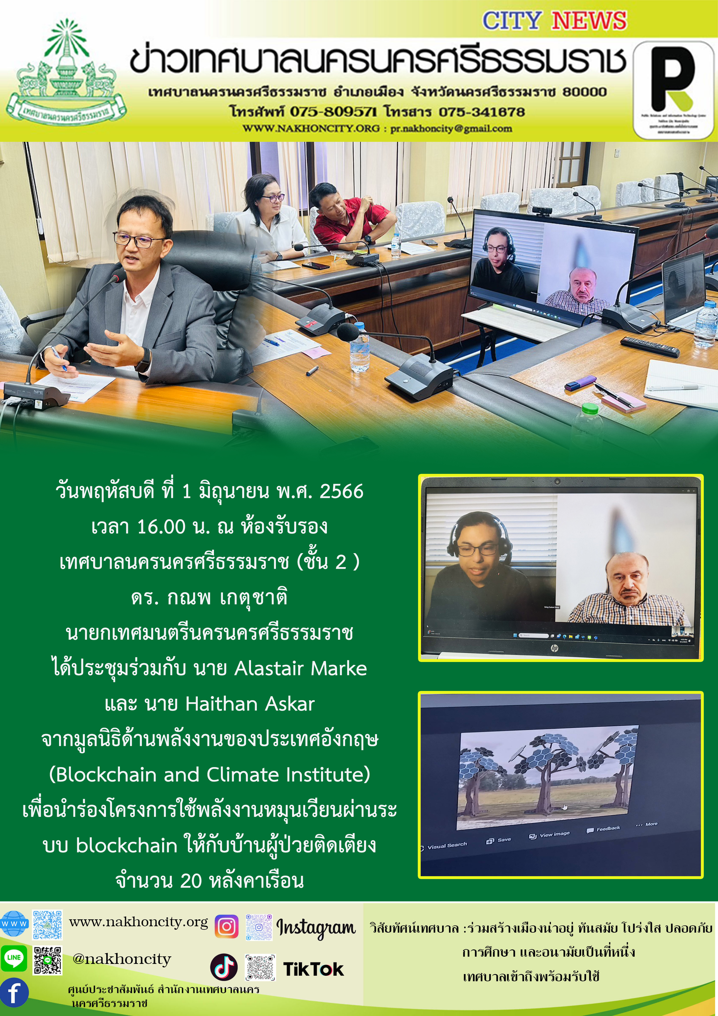 | วันพฤหัสบดี ที่ 1 มิถุนายน พ.ศ. 2566 เวลา 16.00 น. ณ ห้องรับรอง เทศบาลนครนครศรีธรรมราช (ชั้น 2 ) ดร. กณพ เกตุชาติ นายกเทศมนตรีนครนครศรีธรรมราช ได้ประชุมร่วมกับ นาย Alastair Marke และ นาย Haithan Askar จากมูลนิธิด้านพลังงานของประเทศอังกฤษ (Blockchain and Climate Institute) เพื่อนำร่องโครงการใช้พลังงานหมุนเวียนผ่านระบบ blockchain ให้กับบ้านผู้ป่วยติดเตียง จำนวน 20 หลังคาเรือน |
