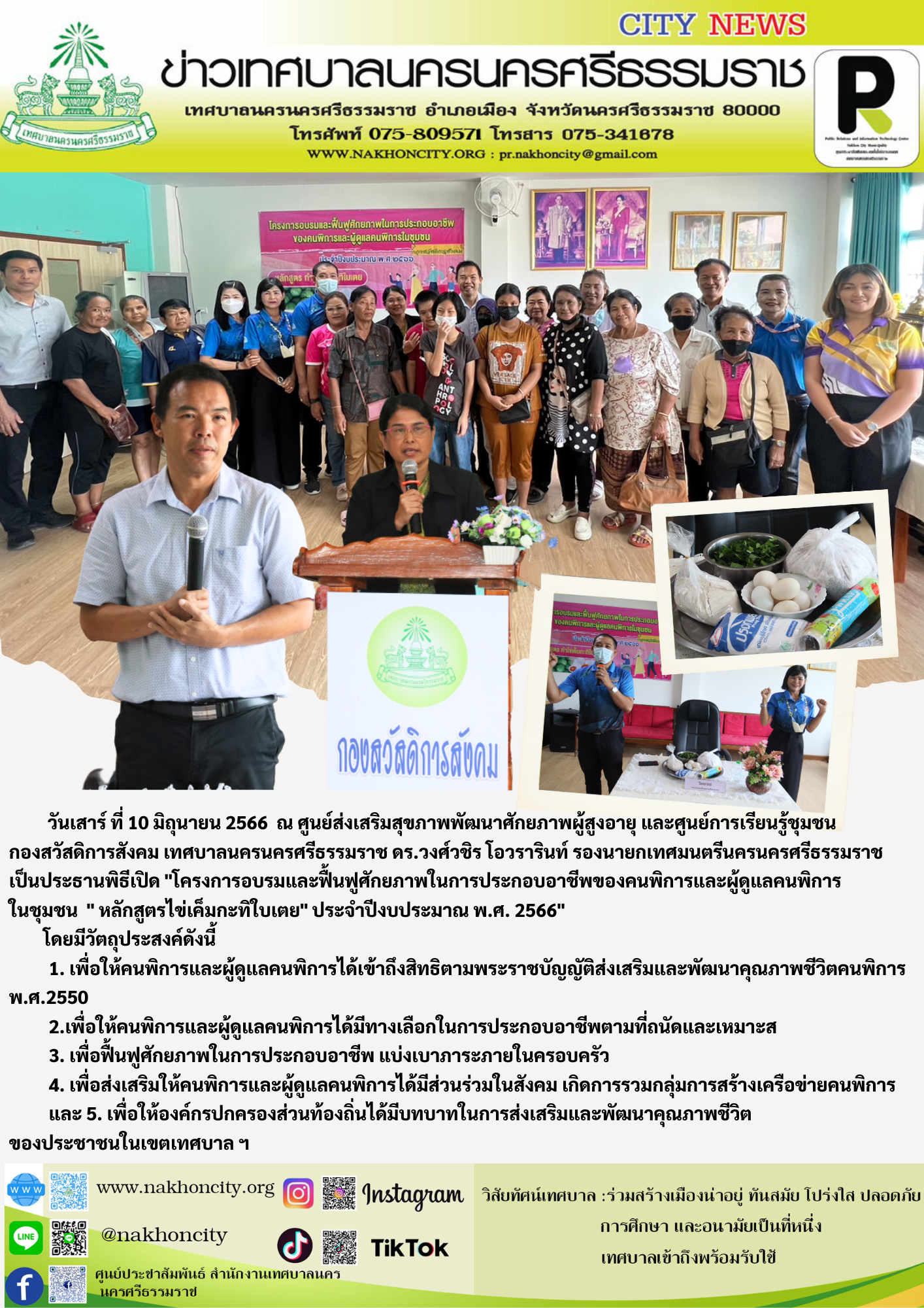 | วันเสาร์ ที่ 10 มิถุนายน 2566 ณ ศูนย์ส่งเสริมสุขภาพพัฒนาศักยภาพผู้สูงอายุ และศูนย์การเรียนรู้ชุมชน กองสวัสดิการสังคม เทศบาลนครนครศรีธรรมราช ดร.วงศ์วชิร โอวรารินท์ รองนายกเทศมนตรีนครนครศรีธรรมราช เป็นประธานพิธีเปิด "โครงการอบรมและฟื้นฟูศักยภาพในการประกอบอาชีพของคนพิการและผู้ดูแลคนพิการ ในชุมชน " หลักสูตรไข่เค็มกะทิใบเตย" ประจำปีงบประมาณ พ.ศ. 2566" โดยมีวัตถุประสงค์ดังนี้ 1. เพื่อให้คนพิการและผู้ดูแลคนพิการได้เข้าถึงสิทธิตามพระราชบัญญัติส่งเสริมและพัฒนาคุณภาพชีวิตคนพิการ พ.ศ.2550 2.เพื่อให้คนพิการและผู้ดูแลคนพิการได้มีทางเลือกในการประกอบอาชีพตามที่ถนัดและเหมาะส 3. เพื่อฟื้นฟูศักยภาพในการประกอบอาชีพ แบ่งเบาภาระภายในครอบครัว 4. เพื่อส่งเสริมให้คนพิการและผู้ดูแลคนพิการได้มีส่วนร่วมในสังคม เกิดการรวมกลุ่มการสร้างเครือข่ายคนพิการ และ 5. เพื่อให้องค์กรปกครองส่วนท้องถิ่นได้มีบทบาทในการส่งเสริมและพัฒนาคุณภาพชีวิต ของประชาชนในเขตเทศบาล ฯ |