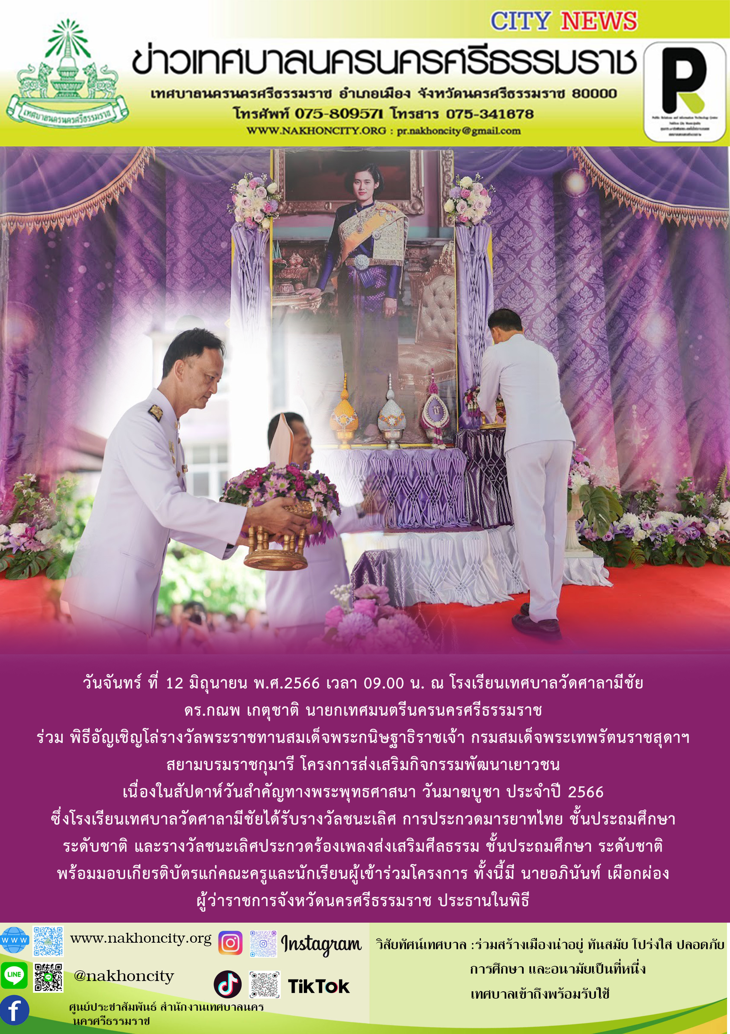 | วันจันทร์ ที่ 12 มิถุนายน พ.ศ.2566 เวลา 09.00 น. ณ โรงเรียนเทศบาลวัดศาลามีชัย ดร.กณพ เกตุชาติ นายกเทศมนตรีนครนครศรีธรรมราช