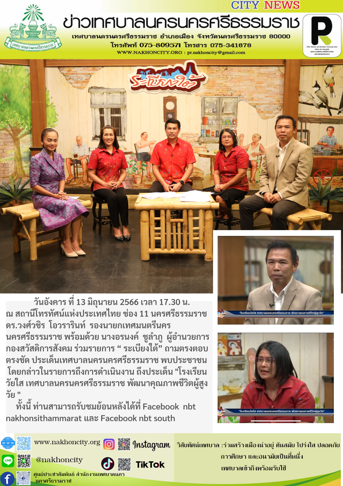 | วันอังคาร ที่ 13 มิถุนายน 2566 เวลา 17.30 น. ณ สถานีโทรทัศน์แห่งประเทศไทย ช่อง 11 นครศรีธรรมราช ดร.วงศ์วชิร โอวรารินท์ รองนายกเทศมนตรีนครนครศรีธรรมราช พร้อมด้วย นางอรนงค์ ชูลำภู ผู้อำนวยการกองสวัสดิการสังคม ร่วมรายการ “ ระเบียงใต้” ถามตรงตอบตรงชัด ประเด็นเทศบาลนครนครศรีธรรมราช พบประชาชนโดยกล่าวในรายการถึงการดำเนินงาน ถึงประเด็น "โรงเรียนวัยใส เทศบาลนครนครศรีธรรมราช พัฒนาคุณภาพชีวิตผู้สูงวัย " ทั้งนี้ ท่านสามารถรับชมย้อนหลังได้ที่ Facebook nbt nakhonsithammarat และ Facebook nbt south |