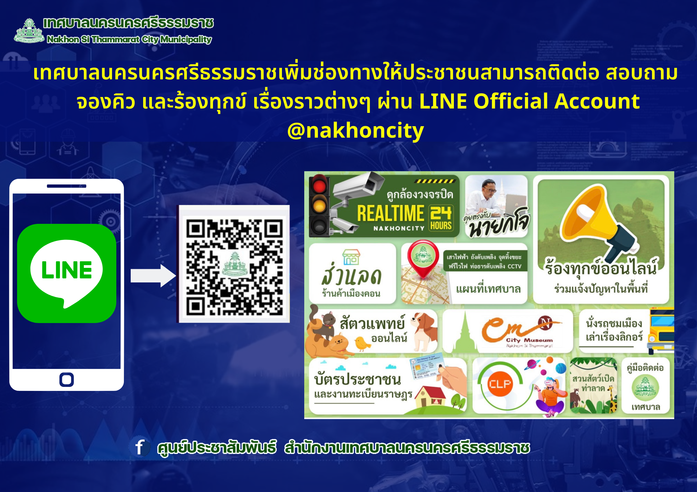 | เทศบาลนครนครศระรรมราช เพิ่มช่องทางให้ประชาชนสามารถติดต่อ สอบถาม จองคิว และร้องทุกข์ เรื่องราวต่างๆ ผ่าน LINE Official Account @nakhoncity |