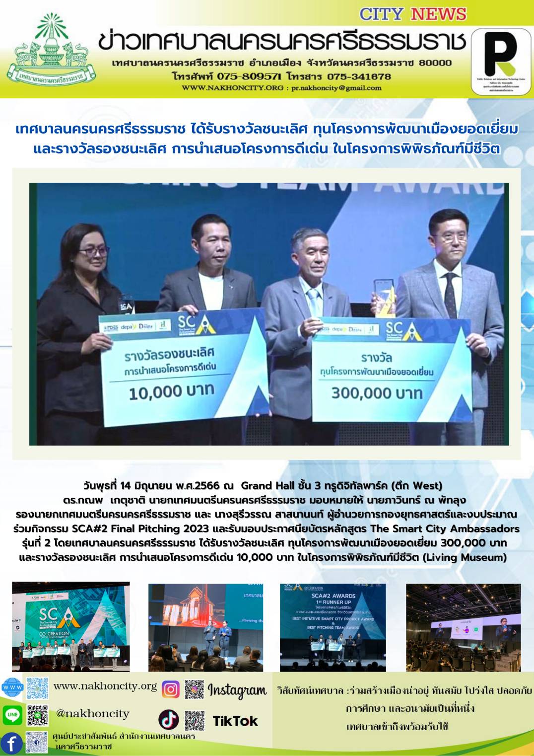 | เทศบาลนครนครศรีธรรมราช ได้รับรางวัลชนะเลิศ ทุนโครงการพัฒนาเมืองยอดเยี่ยม และรางวัลรองชนะเลิศ การนำเสนอโครงการดีเด่น ในโครงการพิพิธภัณฑ์มีชีวิต (Living Museum) BEST INITIATIVE SMART CITY PROJECT AWARD & BEST PITCHING TEAM AWARD |