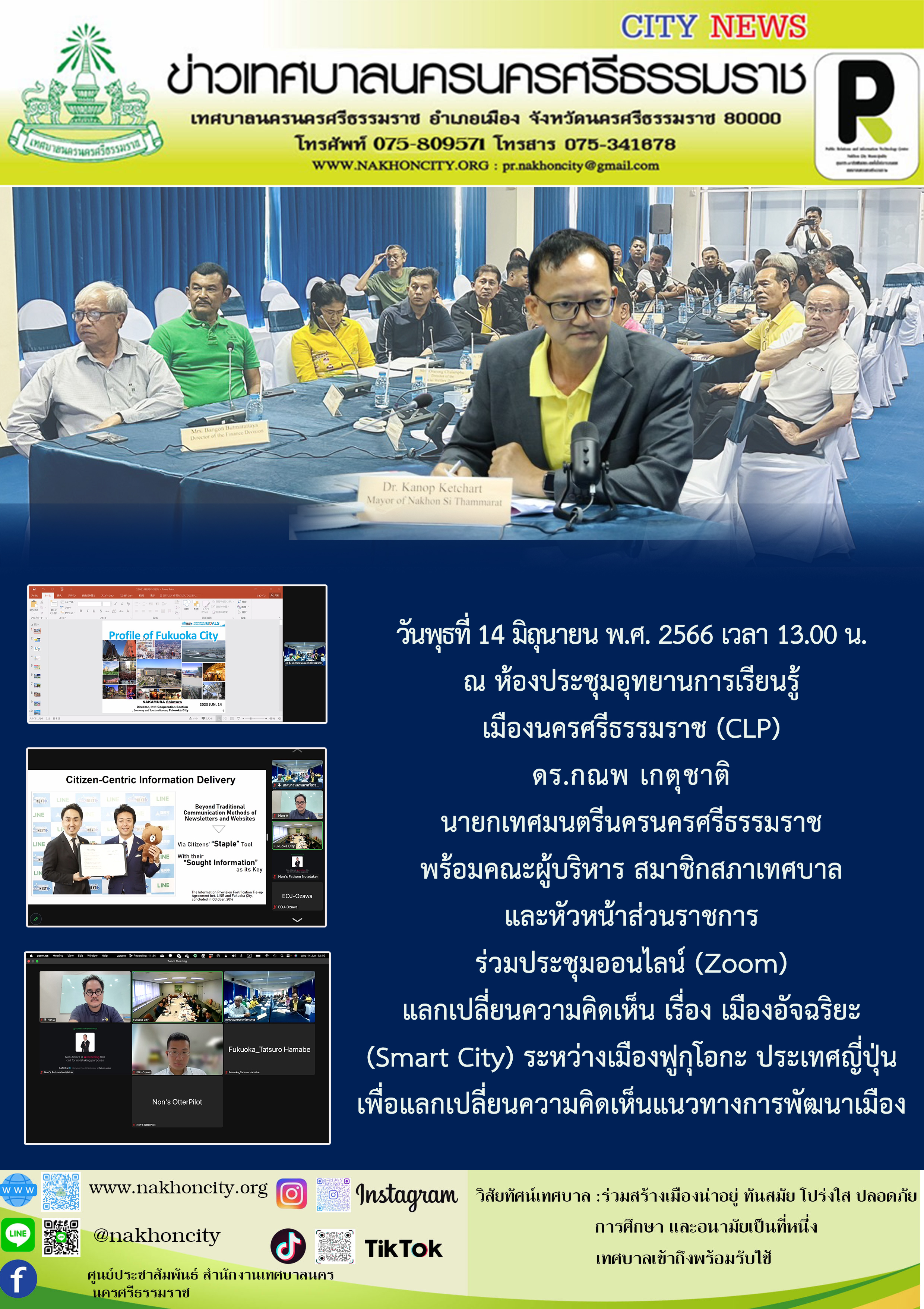 | ดร.กณพ เกตุชาติ นายกเทศมนตรีนครนครศรีธรรมราช พร้อมคณะผู้บริหาร สมาชิกสภาเทศบาล และหัวหน้าส่วนราชการ ร่วมประชุมออนไลน์ (Zoom) แลกเปลี่ยนความคิดเห็น เรื่อง เมืองอัจฉริยะ (Smart City) ระหว่างเมืองฟูกุโอกะ ประเทศญี่ปุ่น |