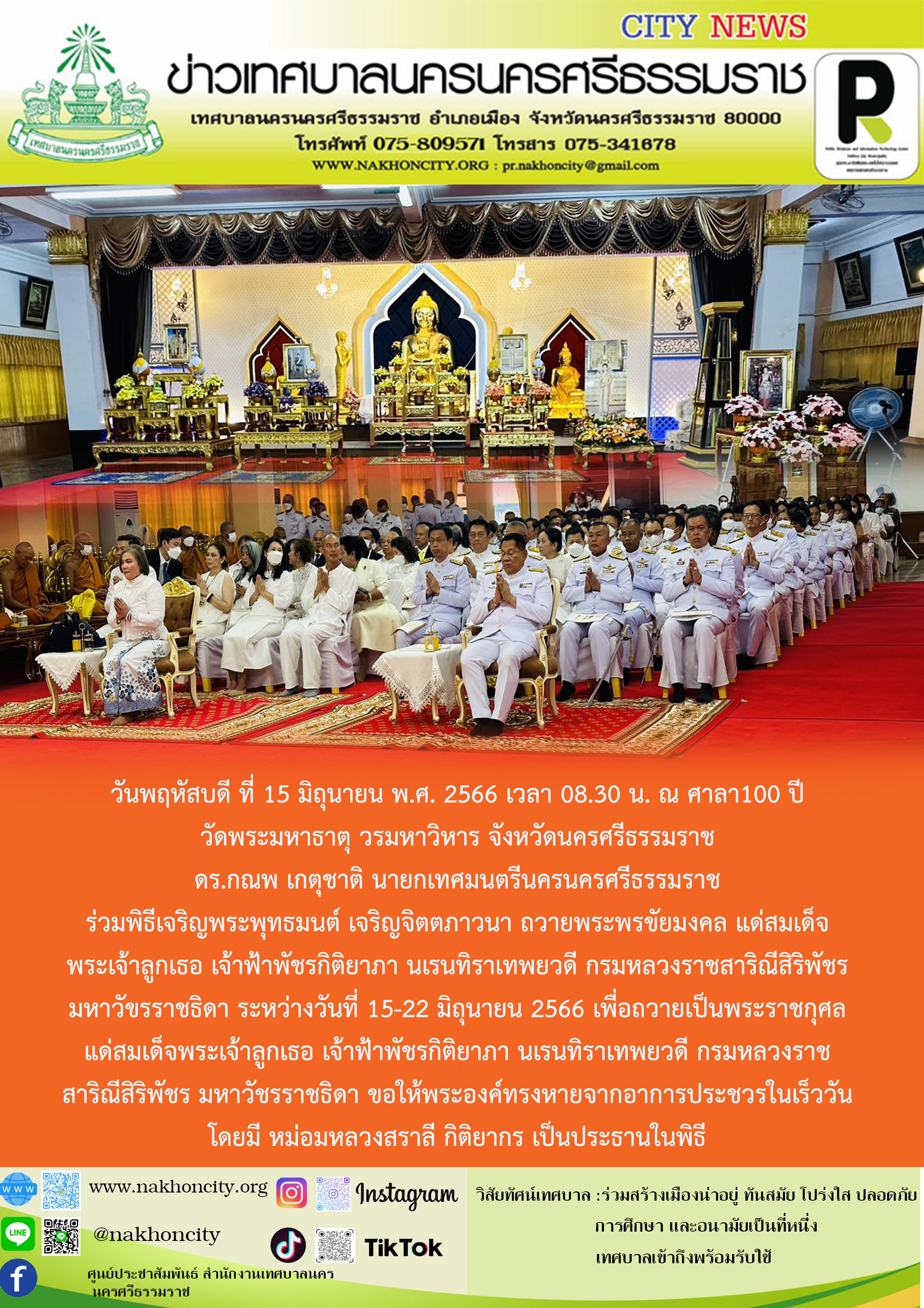 | ดร.กณพ เกตุชาติ นายกเทศมนตรีนครนครศรีธรรมราช ร่วมพิธีเจริญพระพุทธมนต์ เจริญจิตตภาวนา ถวายพระพรขัยมงคล แด่สมเด็จพระเจ้าลูกเธอ เจ้าฟ้าพัชรกิติยาภา นเรนทิราเทพยวดี กรมหลวงราชสาริณีสิริพัชร มหาวัขรราชธิดา ระหว่างวันที่ 15-22 มิถุนายน 2566 |
