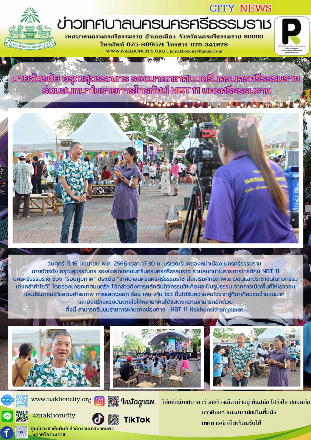 | วันศุกร์ ที่ 16 มิถุนายน พ.ศ. 2566 เวลา 17.00 น. บริเวณริมคลองหน้าเมือง นครศรีธรรมราช นายฉัตรชัย อรุณสุวรรณกร รองนายกเทศมนตรีนครนครศรีธรรมราช ร่วมสนทนาในรายการโทรทัศน์ NBT นครศรีธรรมราช ช่วง “รอบภูมิภาค” ประเด็น “เทศบาลนครนครศรีธรรมราช ส่งเสริมศักยภาพเยาวชนและประชาชนในกิจกรรม เก่งกล้าท้าโชว์”  |