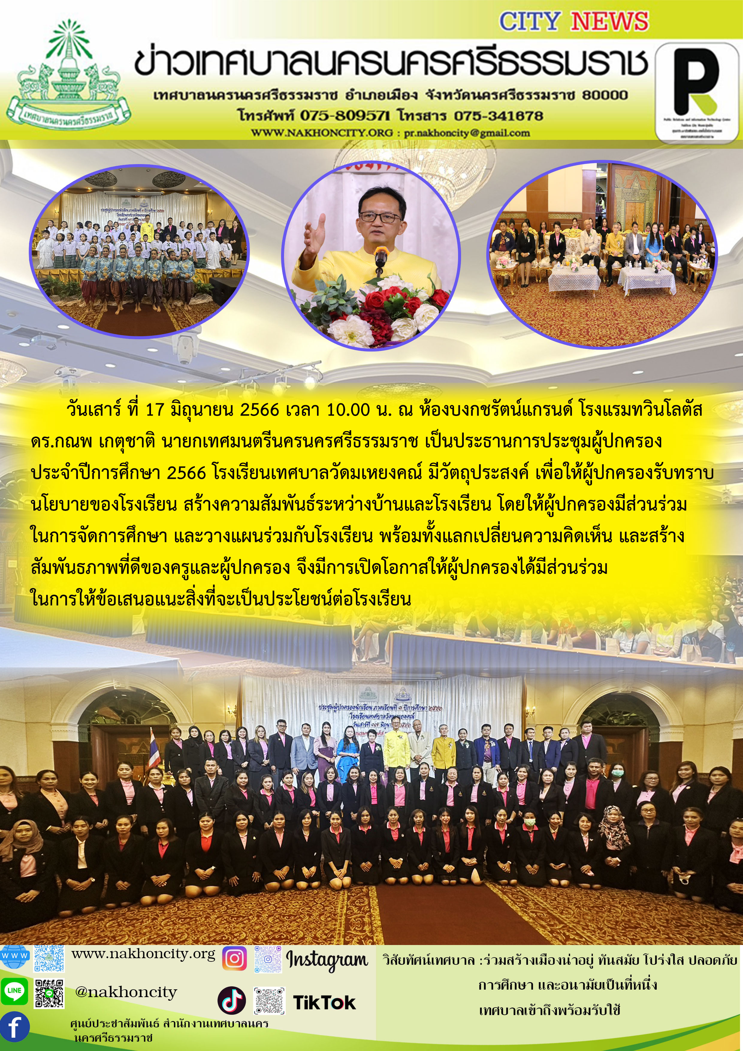 | ดร.กณพ เกตุชาติ นายกเทศมนตรีนครนครศรีธรรมราช เป็นประธานการประชุมผู้ปกครอง ประจำปีการศึกษา 2566 โรงเรียนเทศบาลวัดมเหยงคณ์ |