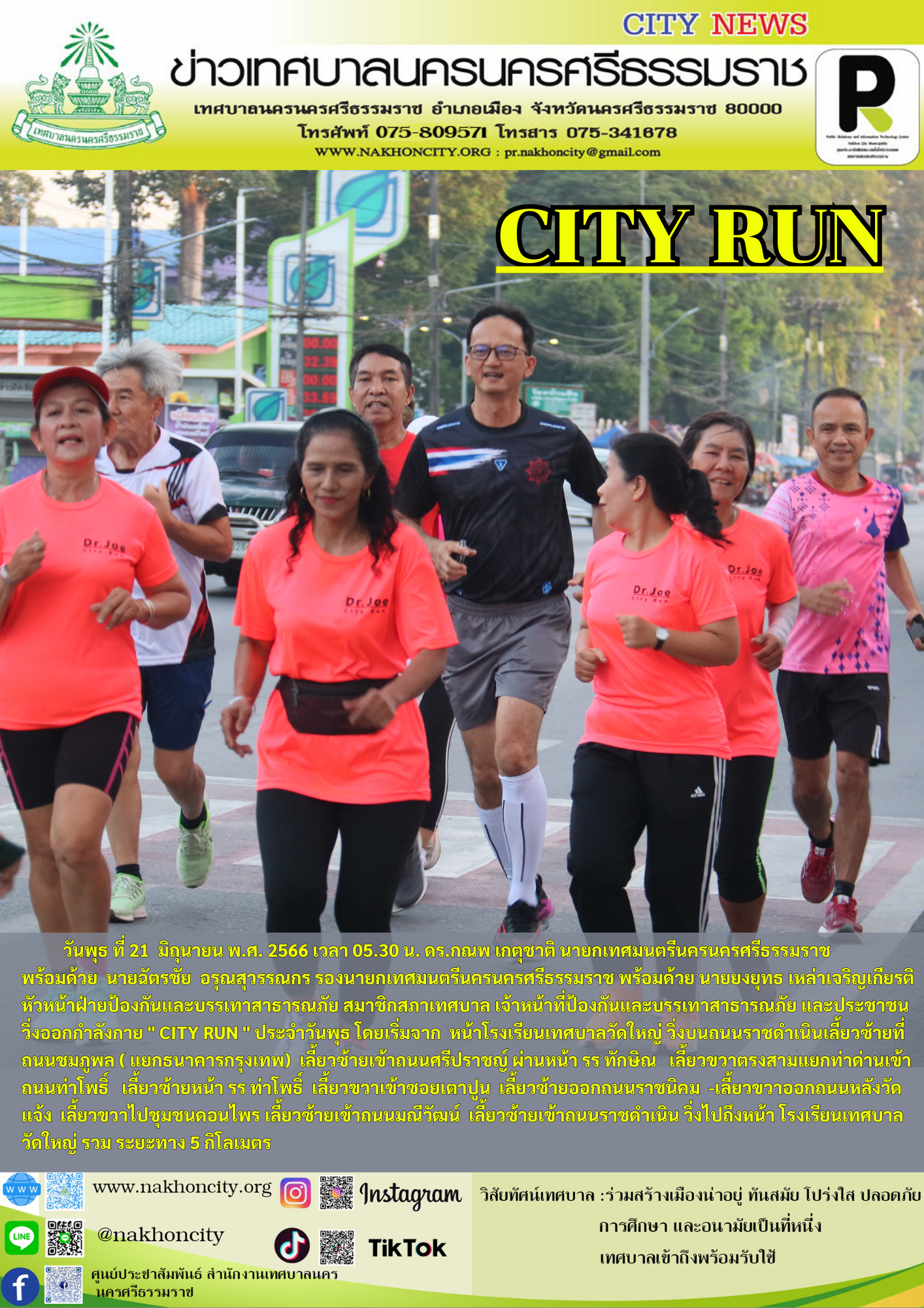 | วันพุธ ที่ 21 มิถุนายน พ.ศ. 2566 เวลา 05.30 น. ดร.กณพ เกตุชาติ นายกเทศมนตรีนครนครศรีธรรมราช พร้อมด้วย นายฉัตรชัย อรุณสุวรรณกร รองนายกเทศมนตรีนครนครศรีธรรมราช พร้อมด้วย นายยงยุทธ เหล่าเจริญเกียรติ หัวหน้าฝ่ายป้องกันและบรรเทาสาธารณภัย สมาชิกสภาเทศบาล เจ้าหน้าที่ป้องกันและบรรเทาสาธารณภัย และประชาชน วิ่งออกกำลังกาย " CITY RUN " ประจำวันพุธ โดยเริ่มจาก หน้าโรงเรียนเทศบาลวัดใหญ่ วิ่งบนถนนราชดำเนิน เลี้ยวซ้ายที่ถนนชมภูพล ( แยกธนาคารกรุงเทพ) - เลี้ยวซ้ายเข้าถนนศรีปราชญ์ ผ่านหน้า รร ทักษิณ - เลี้ยวขวาตรงสามแยกท่าด่านเข้าถนนท่าโพธิ์ - เลี้ยวซ้ายหน้า รร ท่าโพธิ์ - เลี้ยวขวาเข้าซอยเตาปูน -เลี้ยวซ้ายออกถนนราชนิคม - เลี้ยวขวาออกถนนหลังวัดแจ้ง - เลี้ยวขวาไปชุมชนดอนไพร -เลี้ยวซ้ายเข้าถนนมณีวัฒน์ -เลี้ยวซ้ายเข้าถนนราชดำเนิน วิ่งไปถึงหน้า โรงเรียนเทศบาลวัดใหญ่ รวม ระยะทาง 5 กิโลเมตร |