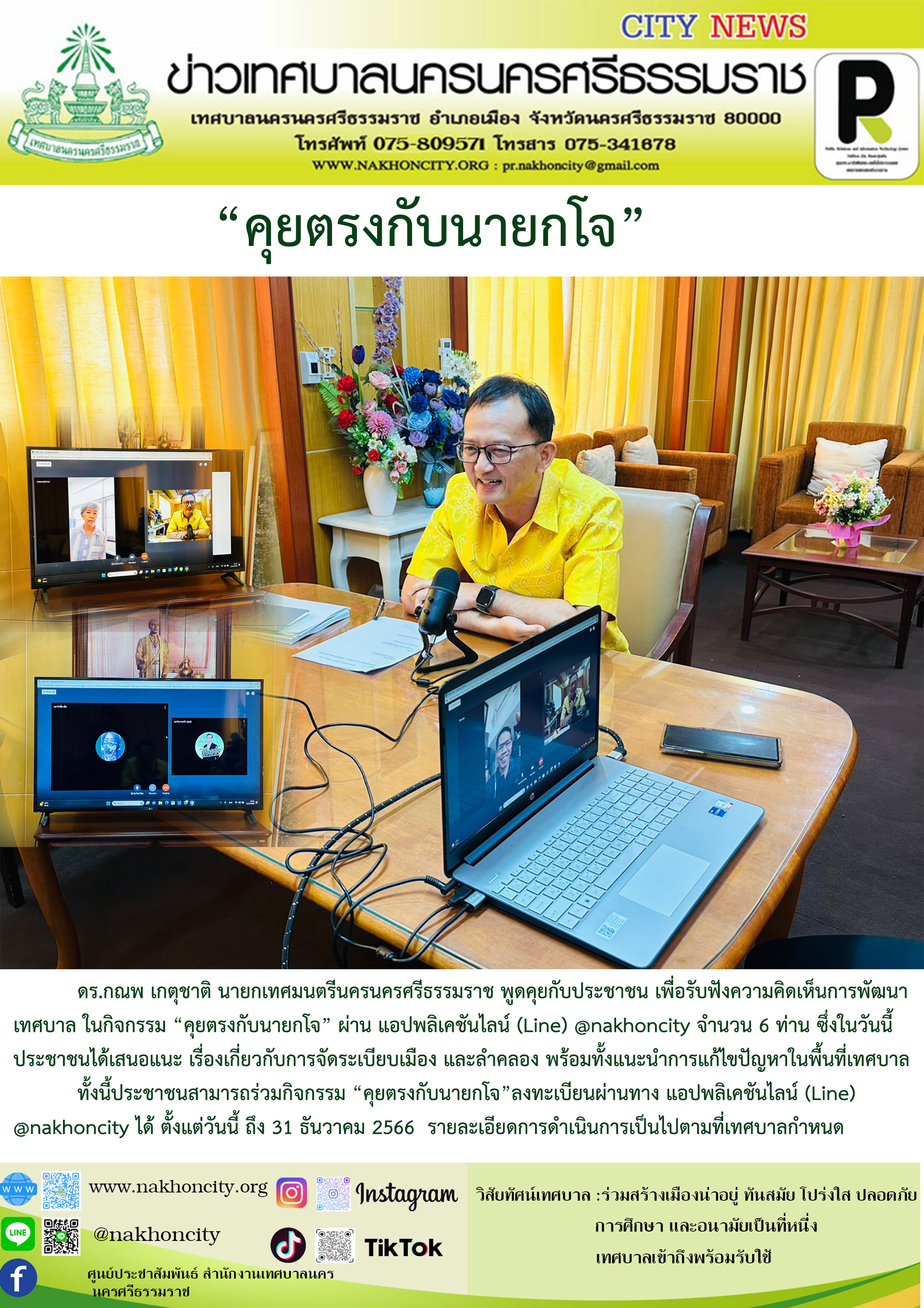 | วันพุธ ที่ 21 มิถุนายน พ.ศ. 2566 เวลา 12.00-14.00 น. ดร.กณพ เกตุชาติ นายกเทศมนตรีนครนครศรีธรรมราช พูดคุยกับประชาชน เพื่อรับฟังความคิดเห็นการพัฒนาเทศบาล ในกิจกรรม “คุยตรงกับนายกโจ” ผ่าน แอปพลิเคชันไลน์ (Line) @nakhoncity จำนวน 6 ท่าน ซึ่งในวันนี้ ประชาชนได้เสนอแนะ เรื่องเกี่ยวกับการจัดระเบียบเมือง และลำคลอง พร้อมทั้งแนะนำการแก้ไขปัญหาในพื้นที่เทศบาล
