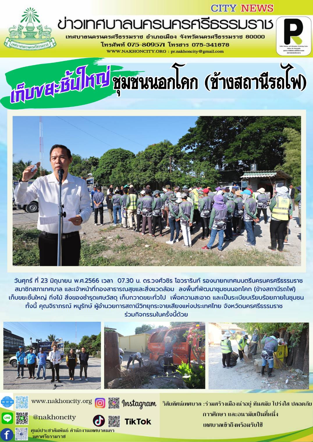| วันศุกร์ ที่ 23 มิถุนายน พ.ศ.2566 เวลา  07.30 น. ดร.วงศ์วชิร โอวรารินท์ รองนายกเทศมนตรีนครนครศรีธรรมราช สมาชิกสภาเทศบาล และเจ้าหน้าที่กองสาธารณสุขและสิ่งแวดล้อม   ลงพื้นที่พัฒนาชุมชนนอกโคก (ข้างสถานีรถไฟ) เก็บขยะชิ้นใหญ่ กิ่งไม้ สิ่งของชำรุดเศษวัสดุ เก็บกวาดขยะทั่วไป  เพื่อความสะอาด และเป็นระเบียบเรียบร้อยภายในชุมชน |