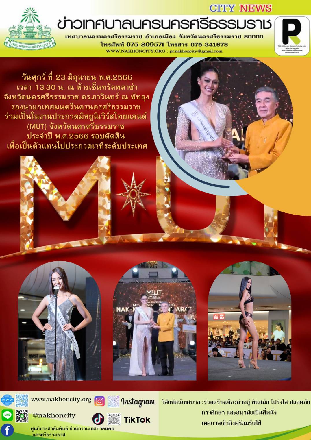 | วันศุกร์ ที่ 23 มิถุนายน พ.ศ.2566 เวลา 13.30 น. ณ ห้างเซ็นทรัลพลาซ่า จังหวัดนครศรีธรรมราช ดร.ภาวินทร์ ณ พัทลุง รองนายกเทศมนตรีนครนครศรีธรรมราช ร่วมเป็นในงานประกวดมิสยูนิเวิร์สไทยแลนด์ (MUT) จังหวัดนครศรีธรรมราช ประจำปี พ.ศ.2566 รอบตัดสิน เพื่อเป็นตัวแทนไปประกวดเวทีระดับประเทศ .................. ภาพ//ข่าว//จันทร์จิรา |
