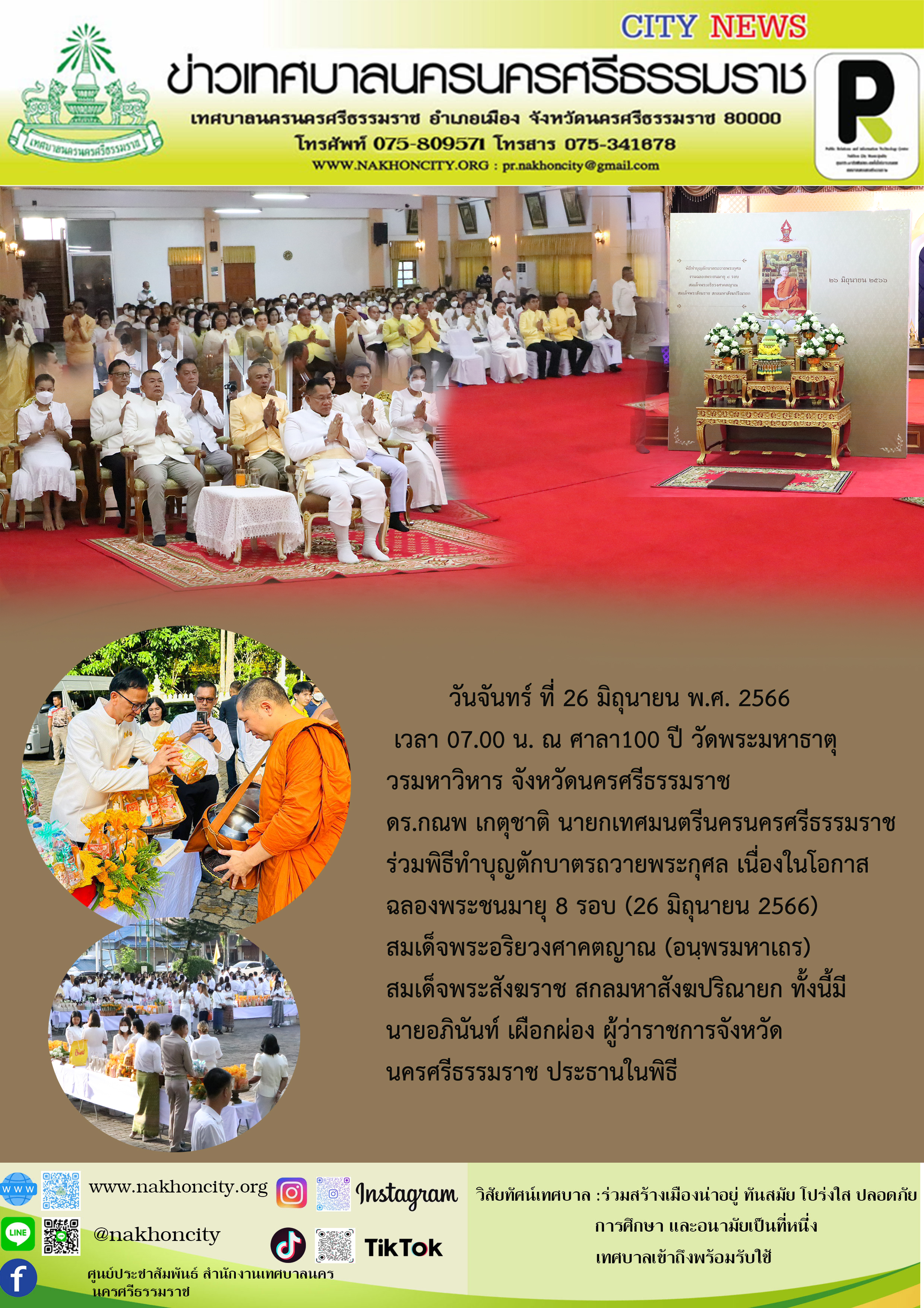 | ดร.กณพ เกตุชาติ นายกเทศมนตรีนครนครศรีธรรมราช ร่วมพิธีทำบุญตักบาตรถวายพระกุศล เนื่องในโอกาสฉลองพระชนมายุ 8 รอบ (26 มิถุนายน 2566) สมเด็จพระอริยวงศาคตญาณ (อนฺพรมหาเถร) สมเด็จพระสังฆราช สกลมหาสังฆปริณายก |