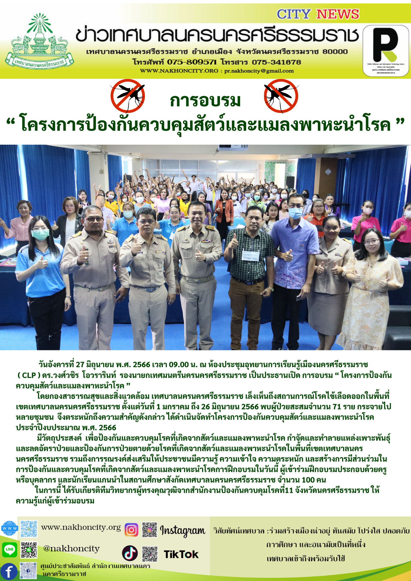 | วันอังคารที่ 27 มิถุนายน พ.ศ. 2566 เวลา 09.00 น. ณ ห้องประชุมอุทยานการเรียนรู้เมืองนครศรีรรมราช ( CLP ) ดร.วงศ์วชิร โอวรารินท์ รองนายกเทศมนตรีนครนครศรีธรรมราช เป็นประธานเปิด การอบรม “ โครงการป้องกันควบคุมสัตว์และแมลงพาหะนำโรค ” โดยกองสาธารณสุขและสิ่งแวดล้อม เทศบาลนครนครศรีธรรมราช เล็งเห็นถึงสถานการณ์โรคไข้เลือดออกในพื้นที่เขตเทศบาลนครนครศรีธรรมราช ตั้งแต่วันที่ 1 มกราคม ถึง 26 มิถุนายน 2566 พบผู้ป่วยสะสมจำนวน 71 ราย กระจายไปหลายชุมชน จึงตระหนักถึงความสำคัญดังกล่าว ได้ดำเนินจัดทำโครงการป้องกันควบคุมสัตว์และแมลงพาหะนำโรค ประจำปีงบประมาณ พ.ศ. 2566 โดยมีวัตถุประสงค์ เพื่อป้องกันและควบคุมโรคที่เกิดจากสัตว์และแมลงพาหะนำโรค กำจัดและทำลาย แหล่งเพาะพันธุ์ และลดอัตราป่วยและป้องกันการป่วยตายด้วยโรคที่เกิดจากสัตว์และแมลงพาหะนำโรคในพื้นที่เขตเทศบาลนครนครศรีธรรมราช รวมถึงการรณรงค์ส่งเสริมให้ประชาชนมีความรู้ ความเข้าใจ ความตระหนัก และสร้างการมีส่วนร่วมในการป้องกันและควบคุมโรคที่เกิดจากสัตว์และแมลงพาหะนำโรค การฝึกอบรมในวันนี้ ผู้เข้าร่วมฝึกอบรมประกอบด้วยครูหรือบุคลากร และนักเรียนแกนนำในสถานศึกษาสังกัดเทศบาลนครนครศรีธรรมราช จำนวน 100 คน ในการนี้ ได้รับเกียรติทีมวิทยากรผู้ทรงคุณวุฒิจากสำนักงานป้องกันควบคุมโรคที่11 จังหวัดนครศรีธรรมราช ให้ความรู้แก่ผู้เข้าร่วมอบรม