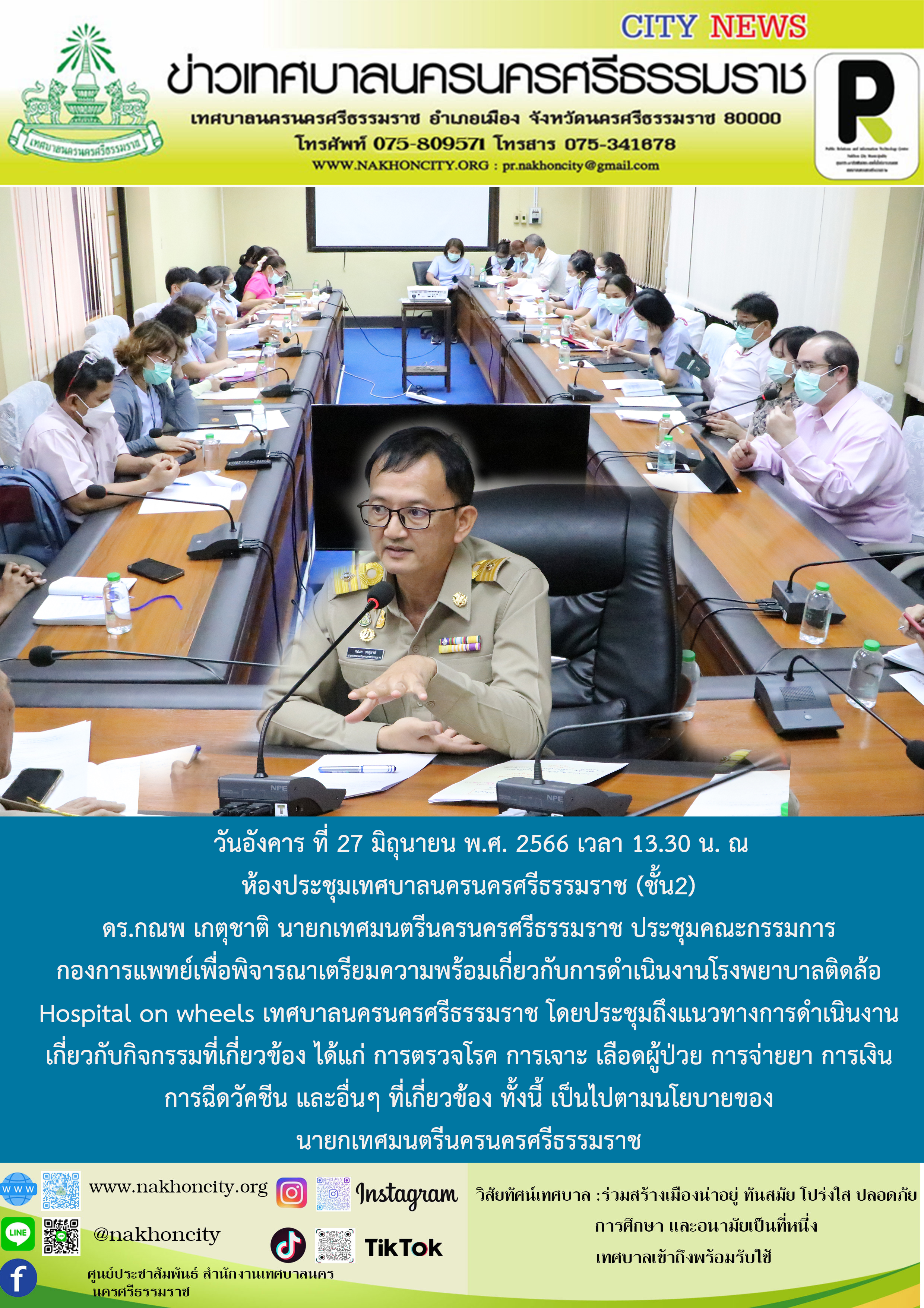 | ดร.กณพ เกตุชาติ นายกเทศมนตรีนครนครศรีธรรมราช ประชุมคณะกรรมการกองการแพทย์เพื่อพิจารณาเตรียมความพร้อมเกี่ยวกับการดำเนินงานโรงพยาบาลติดล้อ Hospital on wheels เทศบาลนครนครศรีธรรมราช |