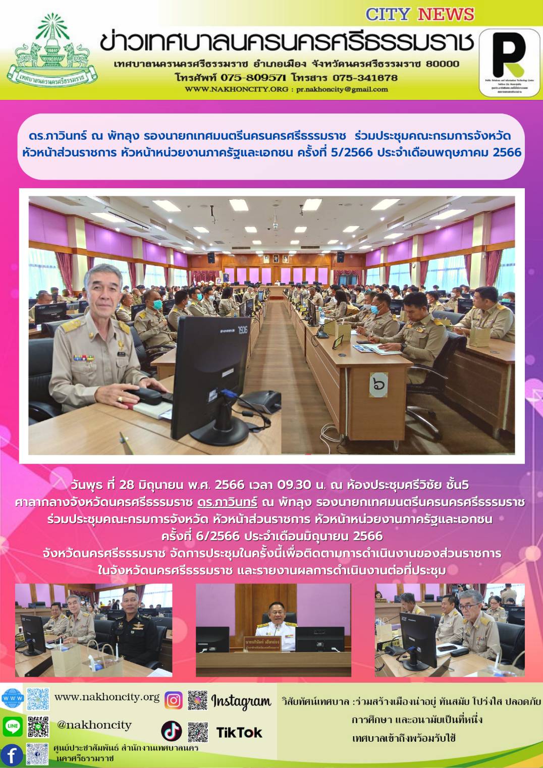 วันพุธ ที่ 28 มิถุนายน พ.ศ. 2566 เวลา 09.30 น. ณ ห้องประชุมศรีวิชัย ชั้น5 ศาลากลางจังหวัดนครศรีธรรมราช ดร.ภาวินทร์ ณ พัทลุง รองนายกเทศมนตรีนครนครศรีธรรมราช  ร่วมประชุมคณะกรมการจังหวัด หัวหน้าส่วนราชการ หัวหน้าหน่วยงานภาครัฐและเอกชน ครั้งที่ 6/2566 ประจำเดือนมิถุนายน 2566 |