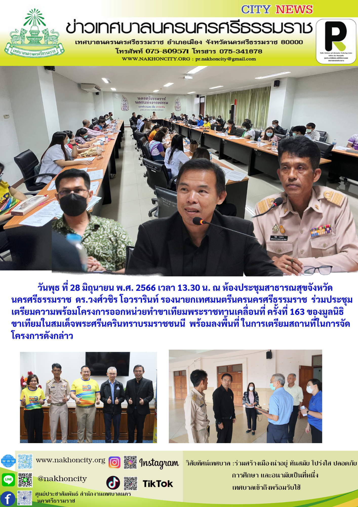 | วันพุธ ที่ 28 มิถุนายน พ.ศ. 2566 เวลา 13.30 น. ณ ห้องประชุมสาธารณสุขจังหวัดนครศรีธรรมราช ดร.วงศ์วชิร โอวรารินท์ รองนายกเทศมนตรีนครนครศรีธรรมราช ร่วมประชุมเตรียมความพร้อมโครงการออกหน่วยทำขาเทียมพระราชทานเคลื่อนที่ ครั้งที่ 163 ของมูลนิธิขาเทียมในสมเด็จพระศรีนครินทราบรมราชชนนี พร้อมลงพื้นที่ ในการเตรียมสถานที่ในการจัดโครงการดังกล่าว |