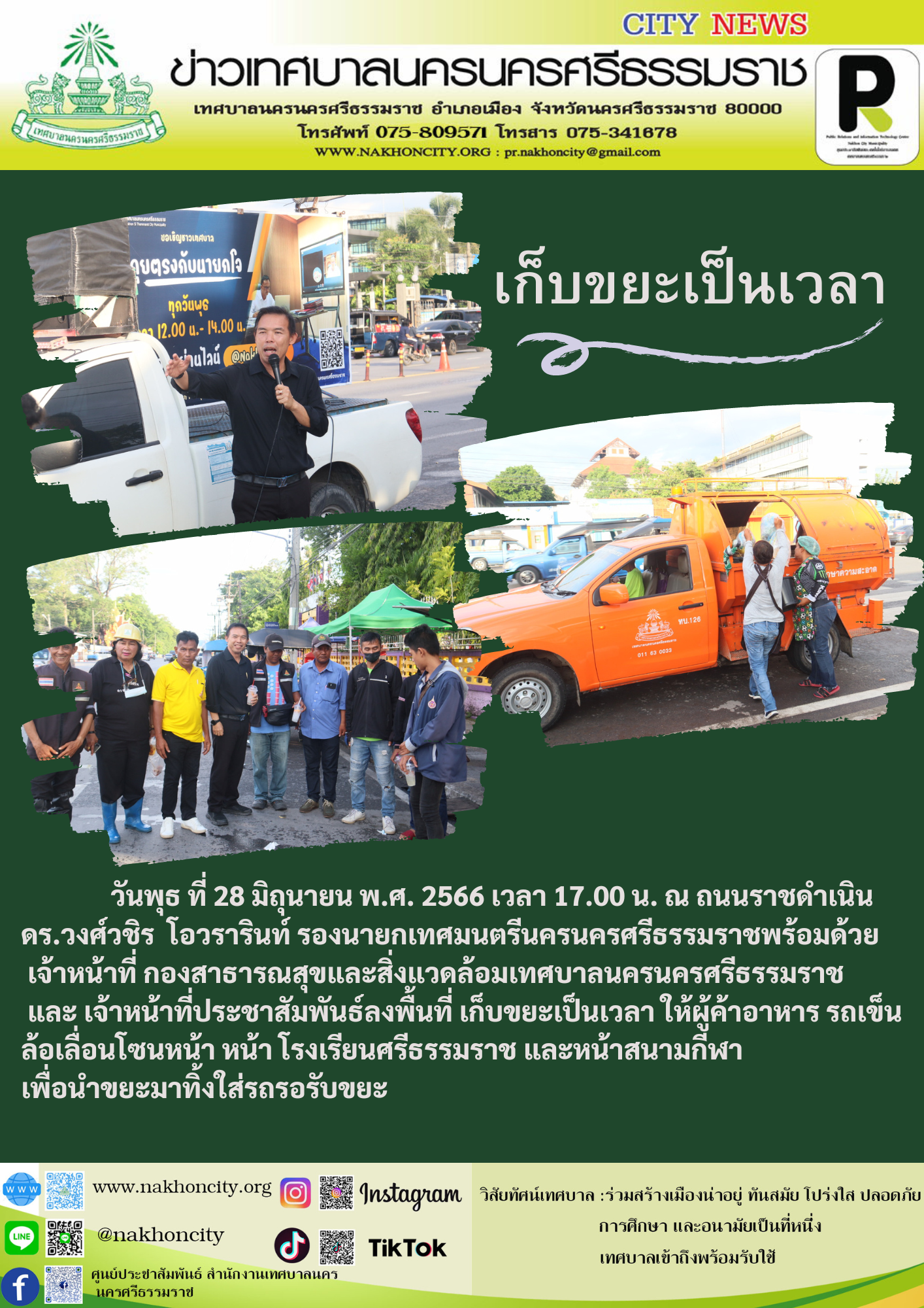 | วันพุธ ที่ 28 มิถุนายน พ.ศ. 2566 เวลา 17.00 น. ดร.วงศ์วชิร โอวรารินท์ รองนายกเทศมนตรีนครนครศรีธรรมราชพร้อมด้วย เจ้าหน้าที่ กองสาธารณสุขและสิ่งแวดล้อมเทศบาลนครนครศรีธรรมราช และ เจ้าหน้าที่ประชาสัมพันธ์ลงพื้นที่ เก็บขยะเป็นเวลา ให้ผู้ค้าอาหาร รถเข็น ล่อเลื่อนโซนหน้า หน้า โรงเรียนศรีธรรมราช และหน้าสนามกีฬา เพื่อนำขยะมาทิ้งใส่รถรอรับขยะ
